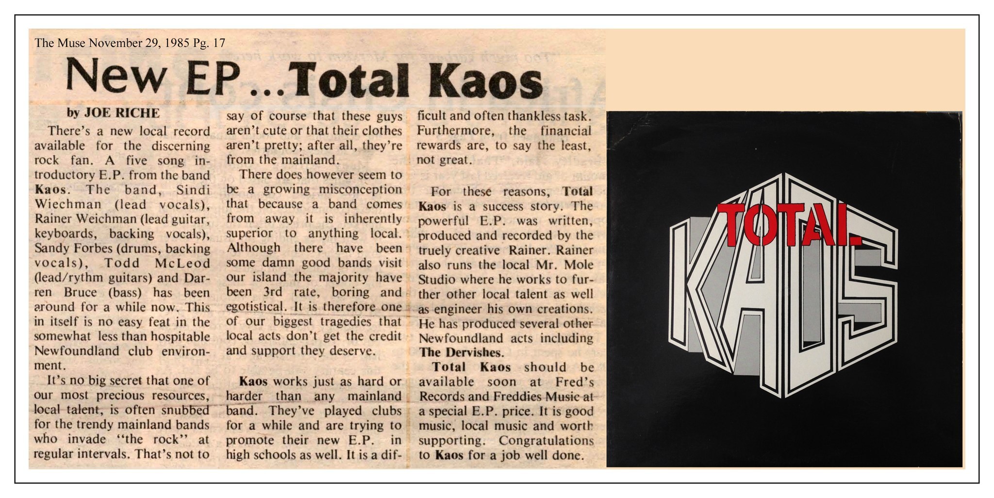 Total Kaos should be available soon at Fred’s Records and Freddies Music at a special E.P. price. It is good music, local music and worth supporting. Congratulations to Kaos for a job well done.