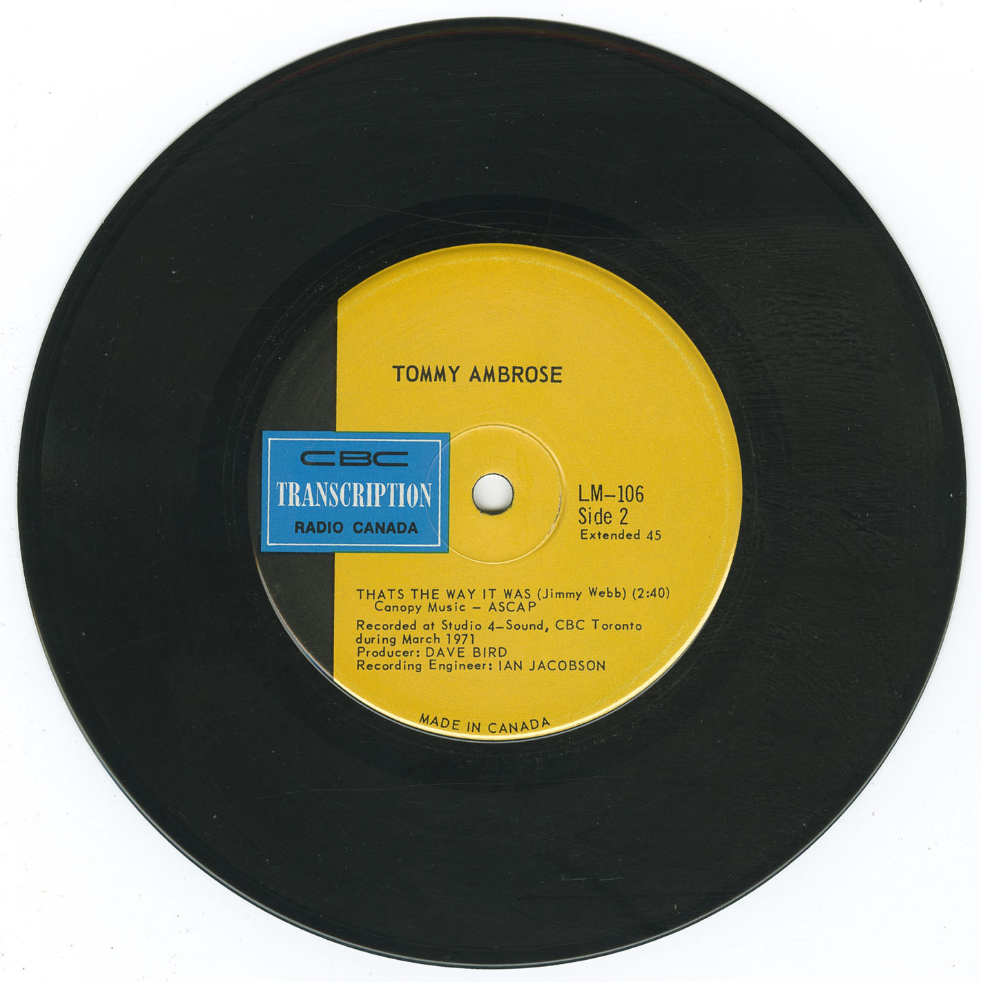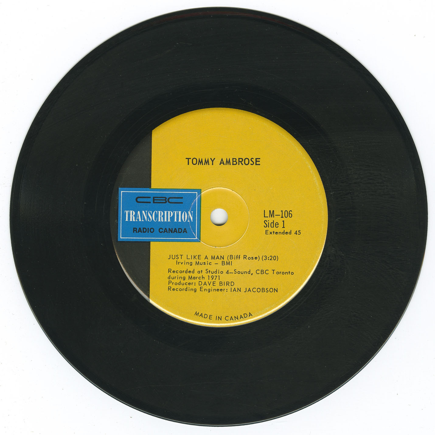 In 1971, Ambrose recorded the single Just Like a Man b/w That’s the Way It Was for CBC Radio Canada (LM 106). Produced by Dave Bird and engineered by Ian Jacobson at Studio 4-Sound in Toronto, it was released as part of CBC’s LM series of broadcast-only promotional 45s.
