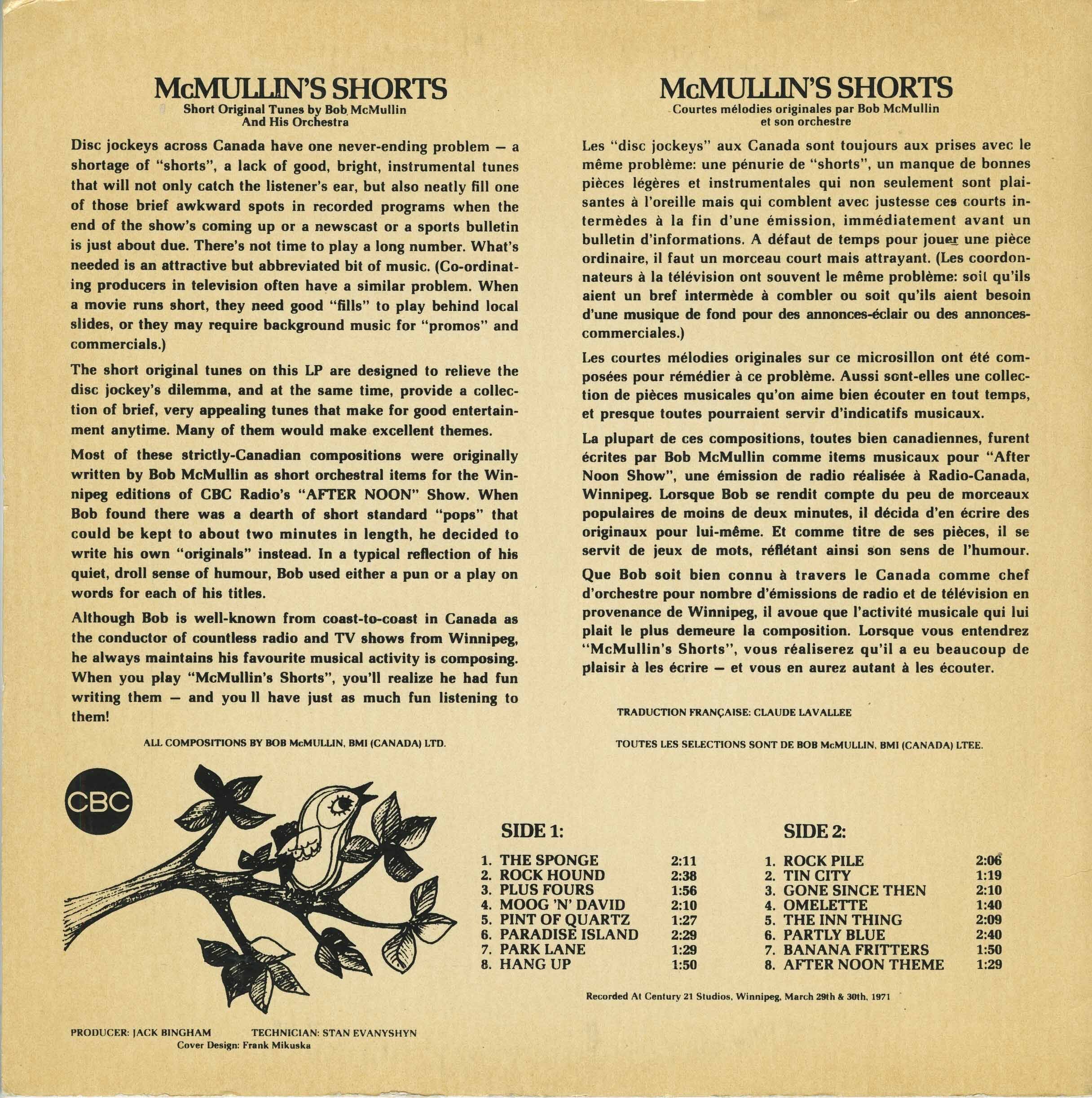 Que Bob soit bien connu à travers le Canada comme chef d’orchestre pour nombre d’émissions de radio et de télévision en provenance de Winnipeg, il avoue que l’activité musicale qui lui plait le plus demeure la composition. Lorsque vous entendrez “McMullin’s Shorts”, vous réaliserez qu’il a eu beaucoup de plaisir à les écrire — et vous en aurez autant à les écouter.