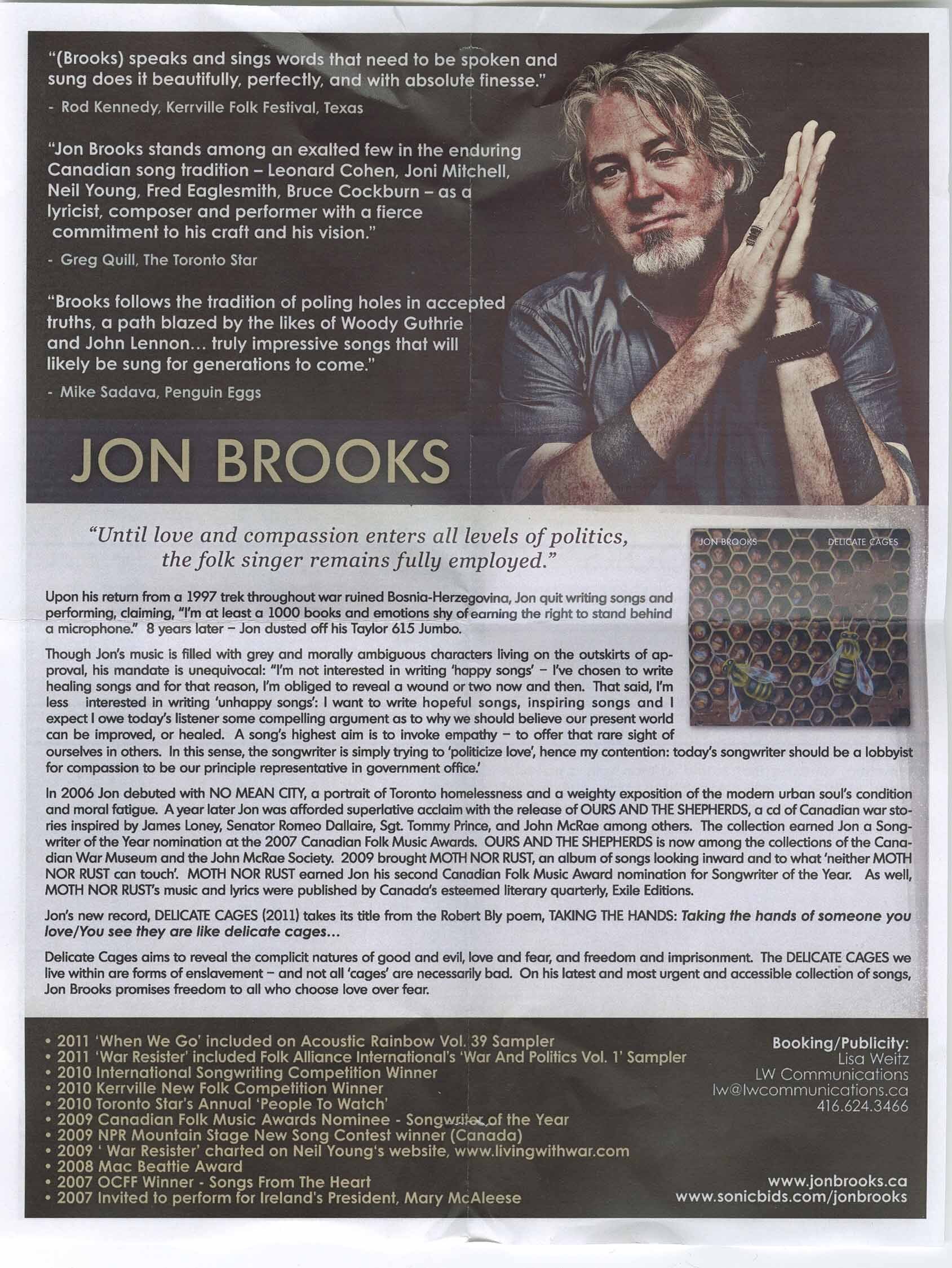 'Political' songwriting is all too often assumed to be shouty simplistic protest, and all too often it is and therefore tends to be ignored by those who should take the most notice of it. Canadian Jon Brooks knows this and his songs are songs first and messages second. The result is a powerful set that cuts to the heart of all that matters, and one that Brooks, a man with a powerful and at times brutally clear-sighted vision, has created armed only with an acoustic guitar, a harmonica, and a gritty ragged voice.