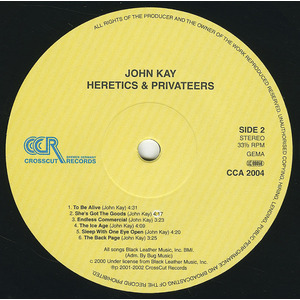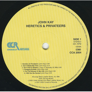In 2000, Crosscut Records in Germany released John Kay's solo album "Heretics & Privateers" on 180 gram pure virgin vinyl. John Kay obtained the last 16 copies on the planet and has autographed them! This collectible, when sold out, will never be available again.