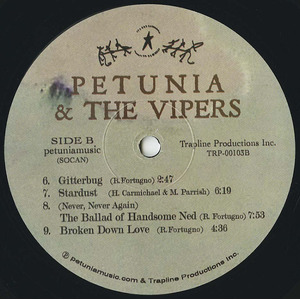 Sometime Vancouverite, full-time yodellin' cowboy Petunia often presents, live and on CD, a stripped-down take on roots music, with his obvious musical antecedents being Jimmie Rodgers and Hank Williams. His new LP - his first full-length to come out on vinyl (with bonus tracks on the CD) - vastly expands his domain, with energetic rockabilly rave-ups ('Maybe Baby Amy', replete with Jerry Lee Lewis yelps) and lush, complex arrangements (with lap steel guitar, horns, kazoo, piano, and deft drum work by Marc L'Esperance). There are also a couple of absolutely fantastic bits of songwriting in evidence, like 'Mercy', which yokes a swingin', revival-tent atmosphere to half-growled lyrics about guilt, sin, redemption, and gambling, delivered with a vocal fire and fury unheard on Petunia's solo CDs. Impressive stuff. This may well be the Vancouver roots-music release of the year.