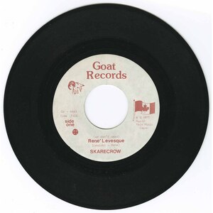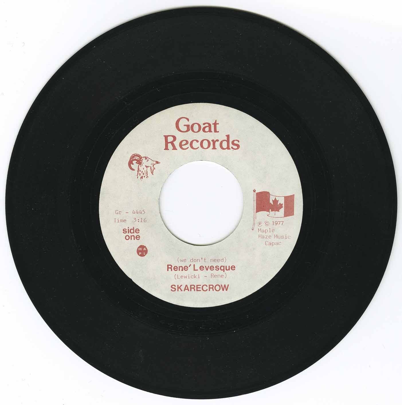 Krys wrote the Rene Levesque song as a tribute to Canada. “It’s such a great honour to play in a band and have the opportunity to travel all over this great Country”. They played everywhere, from one end of the country to the other, from Newfoundland to B.C., Whitehorse, Yellowknife and all parts along the way. For Krys, the potential break-up of the Country was gut-wrenching. He goes on to say, “Rene Levesque was a traitor, and as a Canadian citizen, he dishonoured his duty of allegiance to Canada”. When he wrote the song, he tried to be as respectful as possible. Wolf Rene, the band’s lead guitarist, was French Canadian and handled the French verse. They played the song as part of their set, no matter where they were including places like Longueuil, La Sarre and Montreal. The audience would often give the fist-pump when they played the song, especially the lyrics “with a Canadian flag, he should be hung”. “This is what the RCMP had a problem with” along with the use of the Canadian flag on the cover of the picture sleeve. Goat Records GR 4445 “(We Don’t Need) Rene Levesque” b/w “Oh Canada-Susie Que.” … (As listed by) Skarecrow
