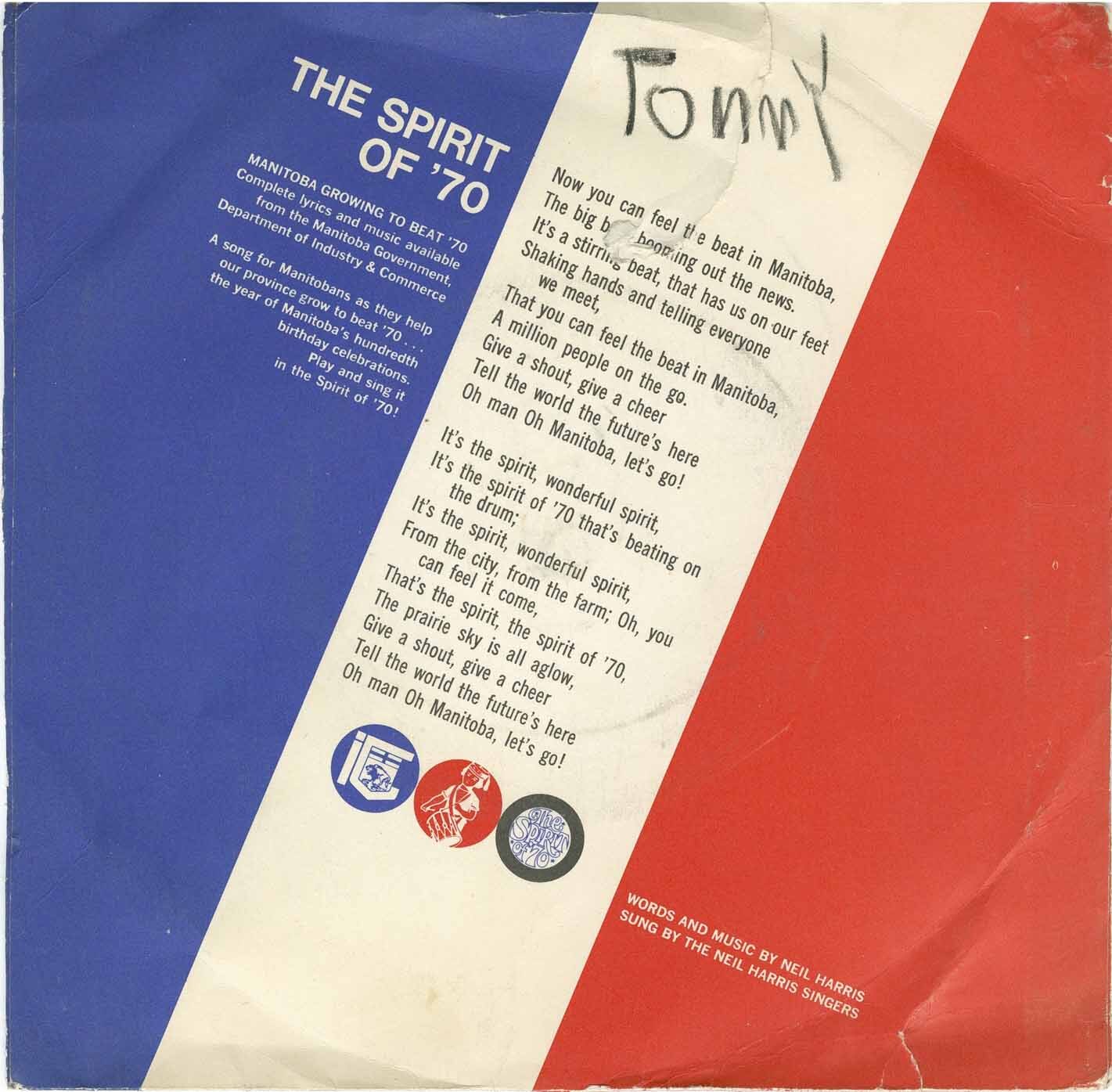 In January 1968, two years before the centennial year, the province announced that Manitoba's Department of Industry and Commerce was releasing Spirit of 70, a song it had commissioned from Manitoba composer Neil Harris.