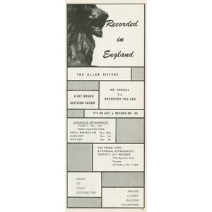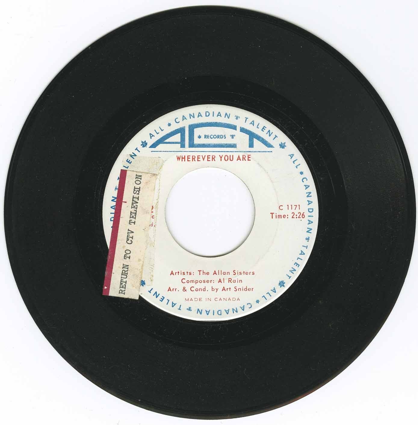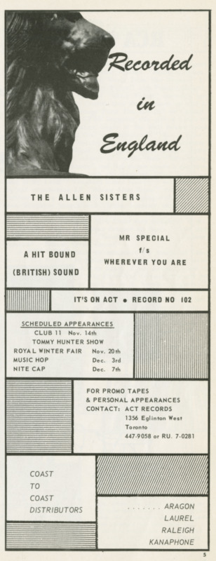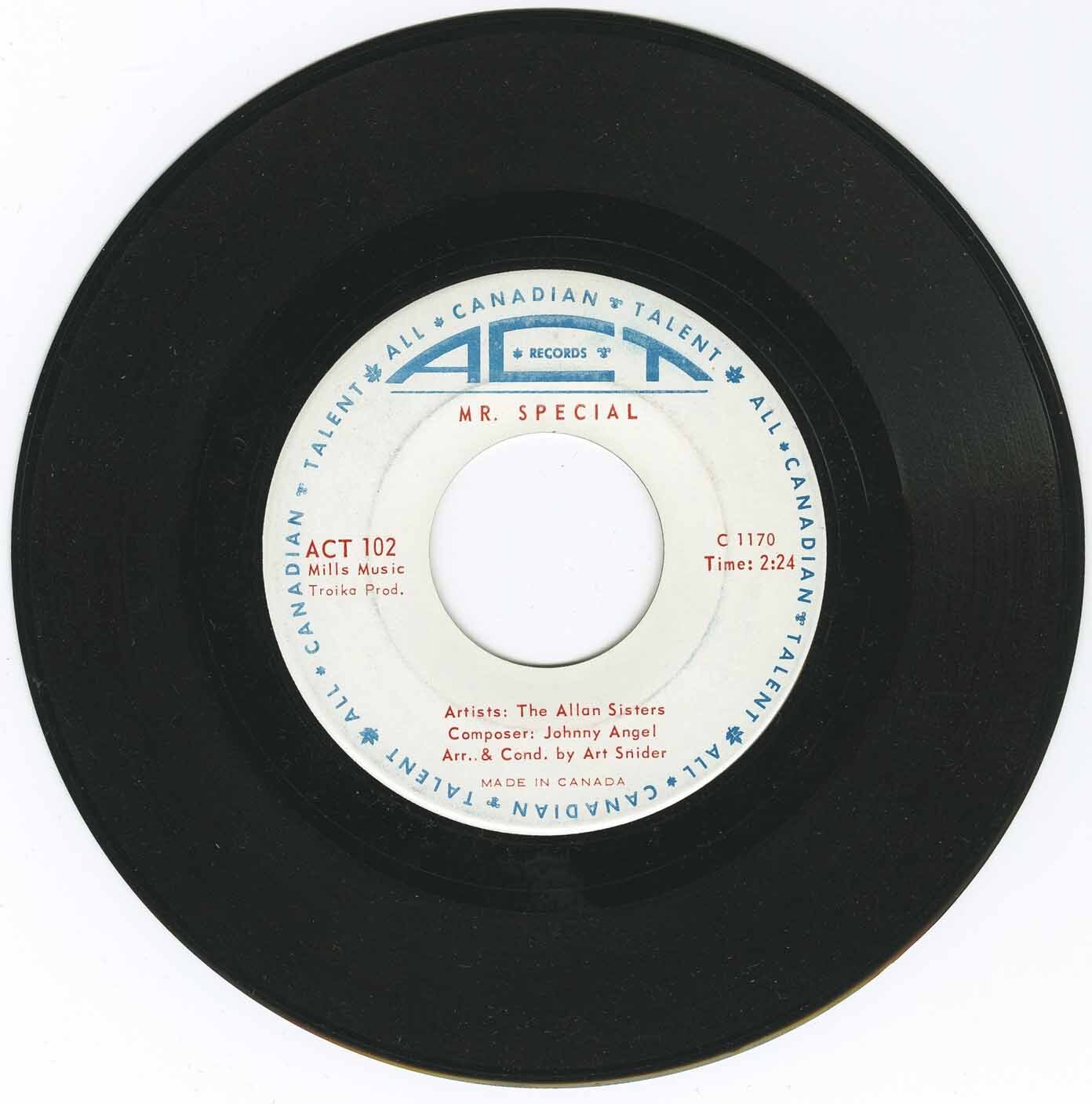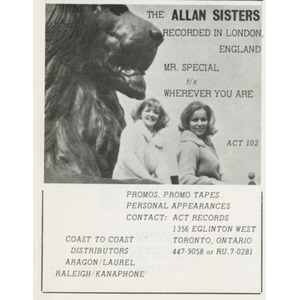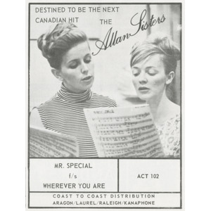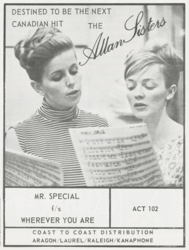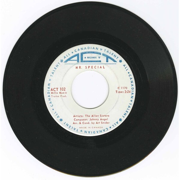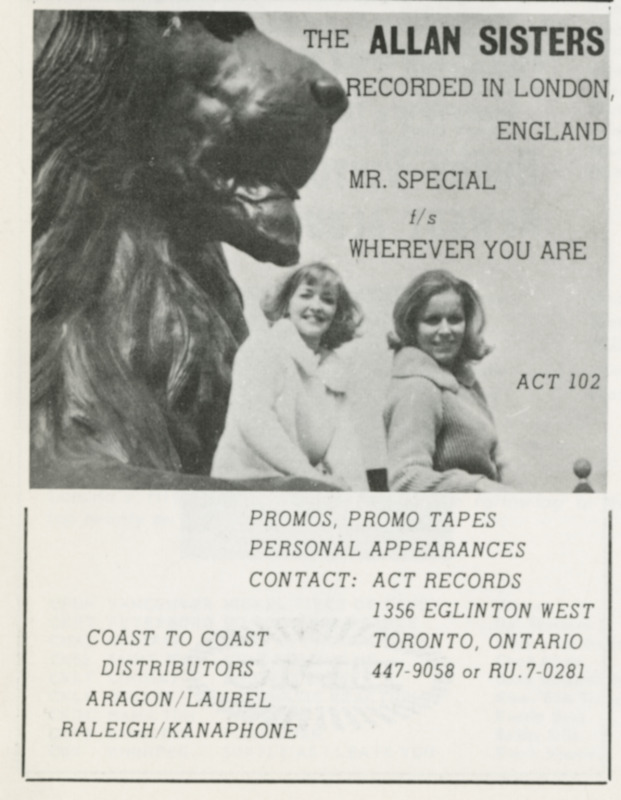 Snider quickly signed them to his new ACT label, and later to the Red Leaf consortium, which he co-founded with Stan Klees and Duff Roman. In October 1964 he took the Allan Sisters and fellow ACT artist Pat Hervey to London, England, where they cut a dozen songs in a whirlwind three-hour session—making them among the first Canadian pop singers to record overseas. From these sessions came “Mr. Special” / “Wherever You Are,” released in late 1964 and warmly received across Canada. More singles followed on Red Leaf, including “Remember the Face” / “In My Diary” and “Your Kind of Love” / “Lonely World.”
