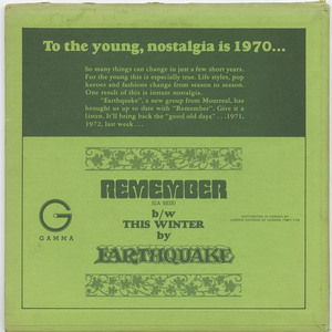 Distributed in Canada by London Records of Canada (1967) Ltd., this Gamma release situates Earthquake firmly within the transitional sounds of the early 1970s, balancing youthful energy with a reflective edge.