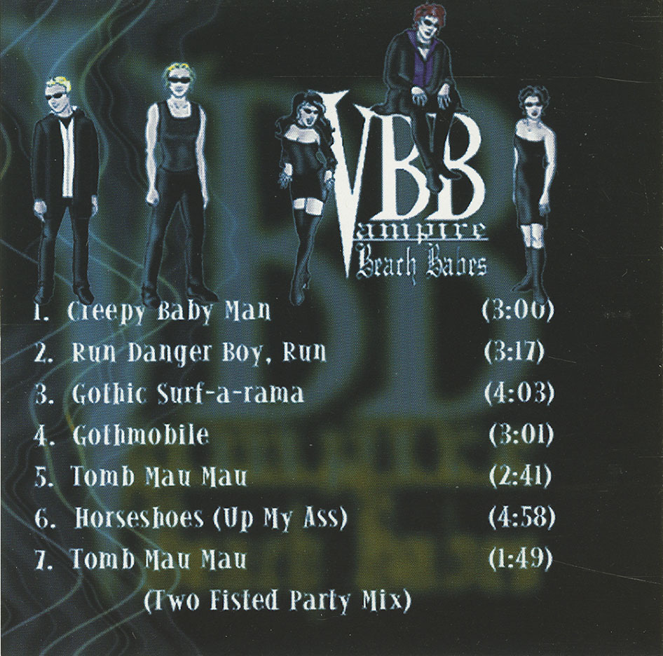 At least some of this hysteria can be blamed on the inclusion of the Vampire Beach Babes underground hit 'Gothic Surf-a-rama' on the premier Gothic music compilation 'Gothic Sanctuary'. Such recognition no doubt exacerbated the spread of the Vampire Beach Babes madness. Their December 1st 2000 performance at the Opera House in Toronto was voted as second best performance of the year 2000 (second to VnV Nation and tied with Nine Inch Nails) by Gothic online community Dark Entries (www.dark-entries.com), further accelerating the spread of this scourge. Cover page mention and feature of the Vampire Beach Babes in the widely celebrated horror magazine Rue Morgue did nothing to protect the general public from this menace. Spanking in New Years 2001 with a midnight performance to 500 wanton fetish scene aficionados, at The Big Bop in Toronto, Canada, brought this insanity to a fevered pitch. Then, Halloween 2001 at the Fetish Masquerade and of course the now infamous RCA Records showcase at CBGB's Gallery in New York City! At Toronto's Velvet Underground in February 2002, the TV camera crews of BRAVO and The New Music did their part in documenting this public menace. Furthermore, the president of TROMA Entertainment (the great Lloyd Kaufman) has hand picked the VBB to write the theme song for TROMA's next worldwide release feature film "Tales From The Crapper".