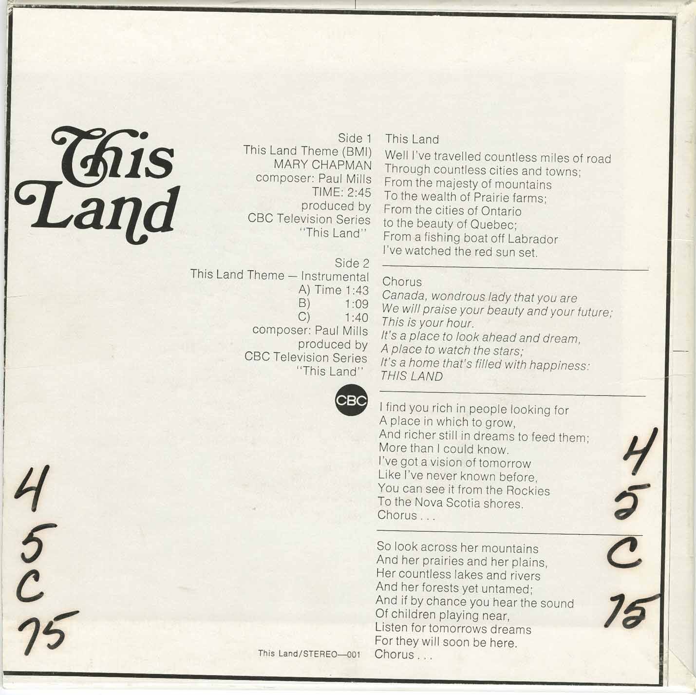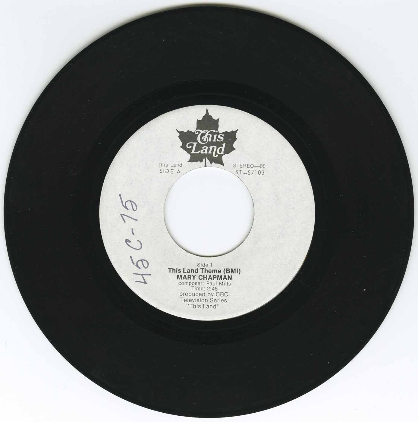 The song was recorded by Mary Chapman, a Toronto vocalist who also co-hosted the series during the mid-1970s. Her delivery was gentle yet powerful, anchoring the music with sincerity and emotional clarity. In 1975 CBC issued the theme as a 45 RPM single, backed with an instrumental version arranged in three shorter movements. The single bore the catalog numbers ST 57103 (Side A) and ST 57104 (Side B), with the etched runouts matching the labels.