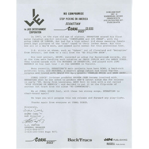On a serious note, the man is a guitarist to be reckoned with. Displaying a fluid style that is deftly complemented by the backing drums and bass, Sebastian weaves a musical trail through the weirdness of North America in the 1980’s. Is he part of that eccentricity himself? You be the judge- the B side of “No Compromise” is called “Stop Picking On America”.