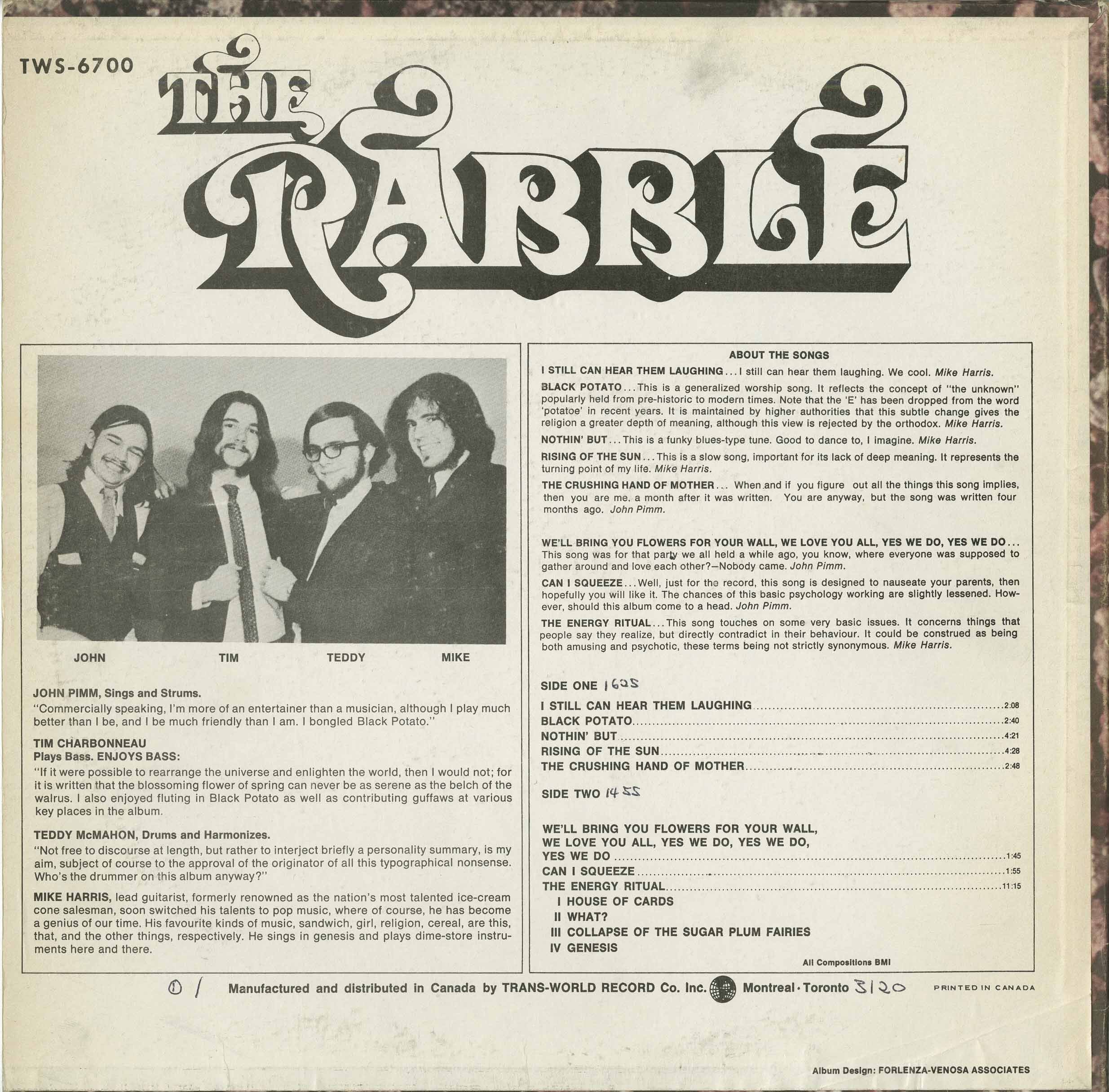 From Montreal, Quebec, this band began life as a high school garage band in 1964 and lasted through to 1970. Original drummer David Wynne recalls:- "Like most of the other band members we had started in high school garage bands (more basement in the Canadian climate) copying the Ventures and Shadows etc, then the Beatles, Stones and Dylan. I left The Rabble in 1965, shortly after Golden Girl was written, to join The Haunted. Their first drummer, Brian Robillard then joined The Rabble..."