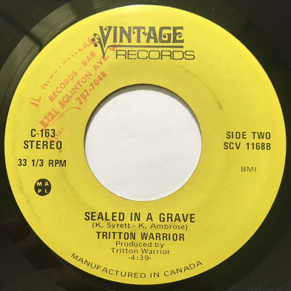 Triton Warrior, named for sea-god Neptune’s son, devised a self-styled “gravel rock,” hammering it out during practices in Fromstein’s family basement. The youths signed justice-of-the-peace notarized waivers, as to legally play local bars and clubs, touring only occasionally outside a 40-mile Toronto perimeter. Recordings commenced at Sound Canada before 1972’s end, resulting in a 2,000-copy run of singles on Vintage Records. “Satan’s Train” took the A-side, with the Fromstein-sung, Mama Moose-sourced, and heavily Sabbath-inspired “Sealed in a Grave” as flip. An errant extra “T” on the 45’s label consigned Triton/Tritton Warrior to eternal pronunciation Hell. But Fromstein’s job with Canada’s 140-store Sam The Record Man chain did afford national distro to the band’s lone release.