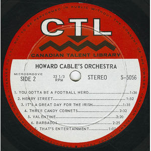 Every bit of Howard Cable’s renowned musicianship shows in the spirited arrangements on this transcription. Whether sailing into the liveliest contemporary show tune like “Henry Street” from FUNNY GIRL, or “A Spoonful of Sugar” from MARY POPPINS—or entertaining with a diverting and original treatment of a novelty tune, such as “Le Fiacre” with its clip-clopping of hoofs and “Three Candy Cornets” (his own composition), Howard Cable’s brilliant individual touch remains in evidence. It’s a distinctive sound which has enlivened many a Canadian radio and television show—and every Canadian listener and viewer would have his own favourite from the formidable list. On radio, Canadian Cavalcade, Parade of Song, Comrades in Arms, Gisele and Mr. Cable, Voice of the Army and Mr. Showbusiness—among many others. On television, the Cable baton led memorable music for G.E. Showtime featuring Shirley Harmer and Robert Goulet. Visitors to the C.N.E. associate Howard Cable automatically with the annual Grandstand Show with all its drama, colour and musical excitement.