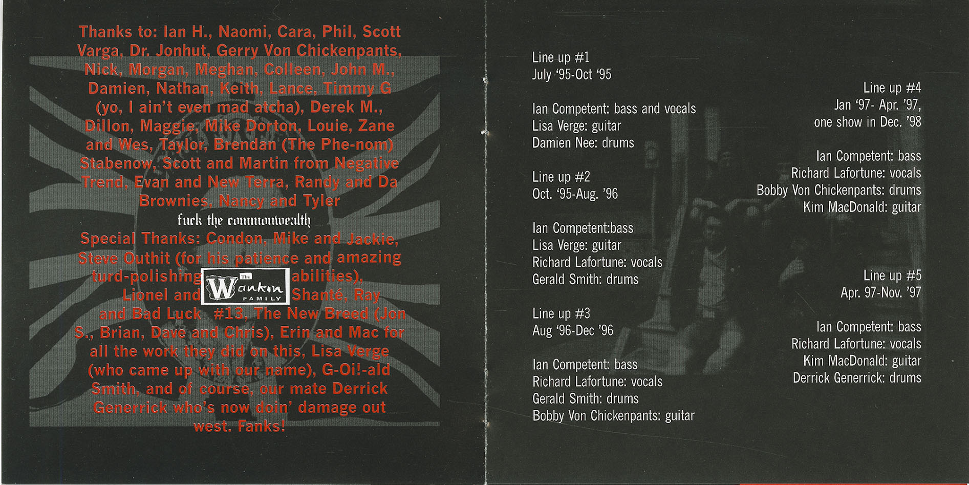 Special Thanks: Condon, Mike and Jackie, Steve Outhit (for his patience and amazing turd-polishing abilities), Lionel and Lamenté, Ray and Bad Luck #13, The New Breed (Jon S., Brian, Dave and Chris), Erin and Mac for all the work they did on this, Lisa Verge (who came up with our name), G-Oil!-ald Smith, and of course, our mate Derrick Generrick who’s now doin’ damage out west. Fanks!