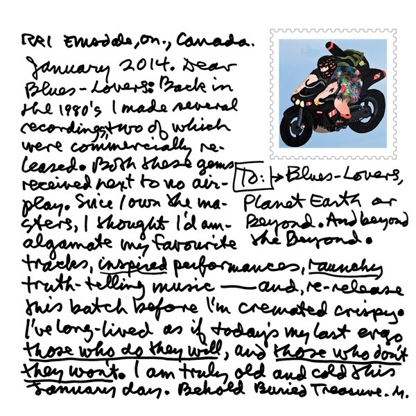 Dear Blues-Lovers: Back in the 1980s, I made several recordings, two of which were commercially released. Both these gems received next to no airplay. Since I own the monsters, I thought I’d amalgamate my favourite tracks, inspired performances, raunchy truth-telling music – and, re-release this batch before I’m cremated crispy. I’ve long-lived as if today’s my last ergo those who do they will, and those who don’t they won’t. I am truly old and cold this January day. Behold Buried Treasure.