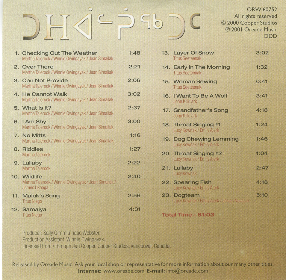This CD has music of the Inuit in the Canadian Northwest Territories. You’ll hear songs varying from throat singing to lullabies. This CD was made possible by The Department of Indian and Northern Affairs (Canada), Calm Air, The Hamlet of Baker Lake.