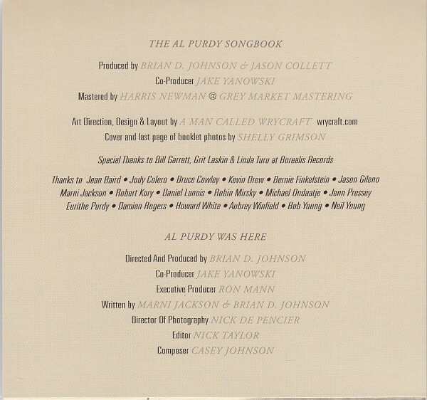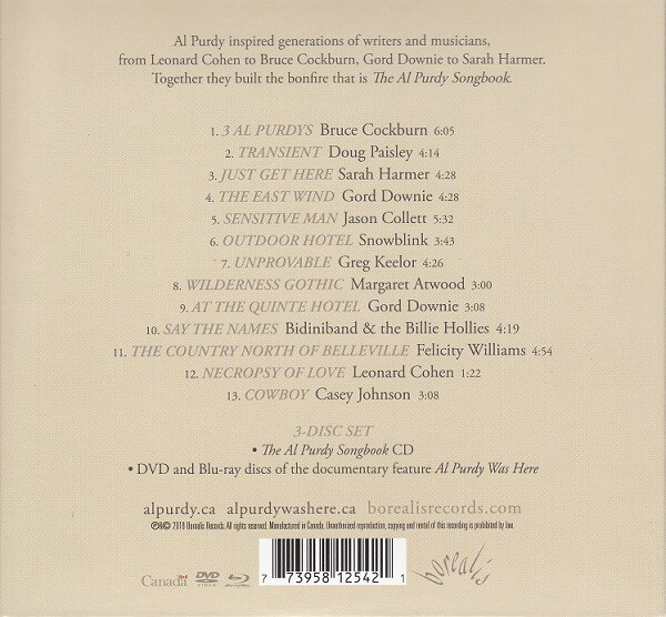 The album, The Al Purdy Songbook, arose from 2015′s Al Purdy Was Here, the vital and eloquent documentary from Brian D. Johnson (the long-time film critic at Maclean’s). Big names contributed songs and readings to the project: Bruce Cockburn, Sarah Harmer, Greg Keelor and Margaret Atwood, among others. The album was long in the making; two participants (Gord Downie and Leonard Cohen) are no longer alive.