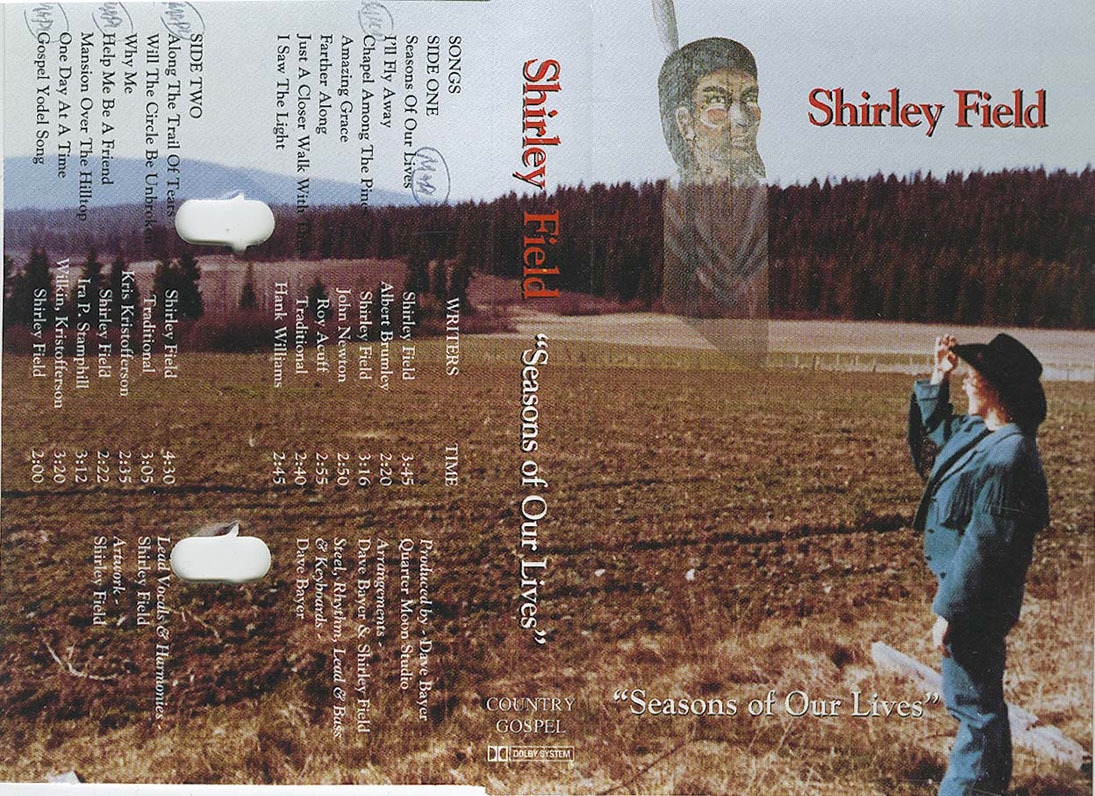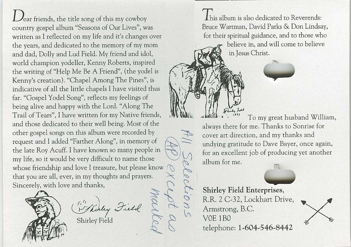 Dear friends, the title song of this my cowboy country gospel album “Seasons of Our Lives”, was written as I reflected on my life and it’s changes over the years, and dedicated to the memory of my mom and dad, Dolly and Lud Field. My friend and idol, world champion yodeller, Kenny Roberts, inspired the writing of “Help Me Be A Friend”, (the yodel is Kenny’s creation). “Chapel Among The Pines”, is indicative of all the little chapels I have visited thus far. “Gospel Yodel Song”, reflects my feelings of being alive and happy with the Lord. “Along The Trail of Tears”, I have written for my Native friends, and those dedicated to their well being. Most of the other gospel songs on this album were recorded by request and I added “Farther Along”, in memory of the late Roy Acuff. I have known so many people in my life, so it would be very difficult to name those whose friendship and love I treasure, but please know that you are all, ever, in my thoughts and prayers.