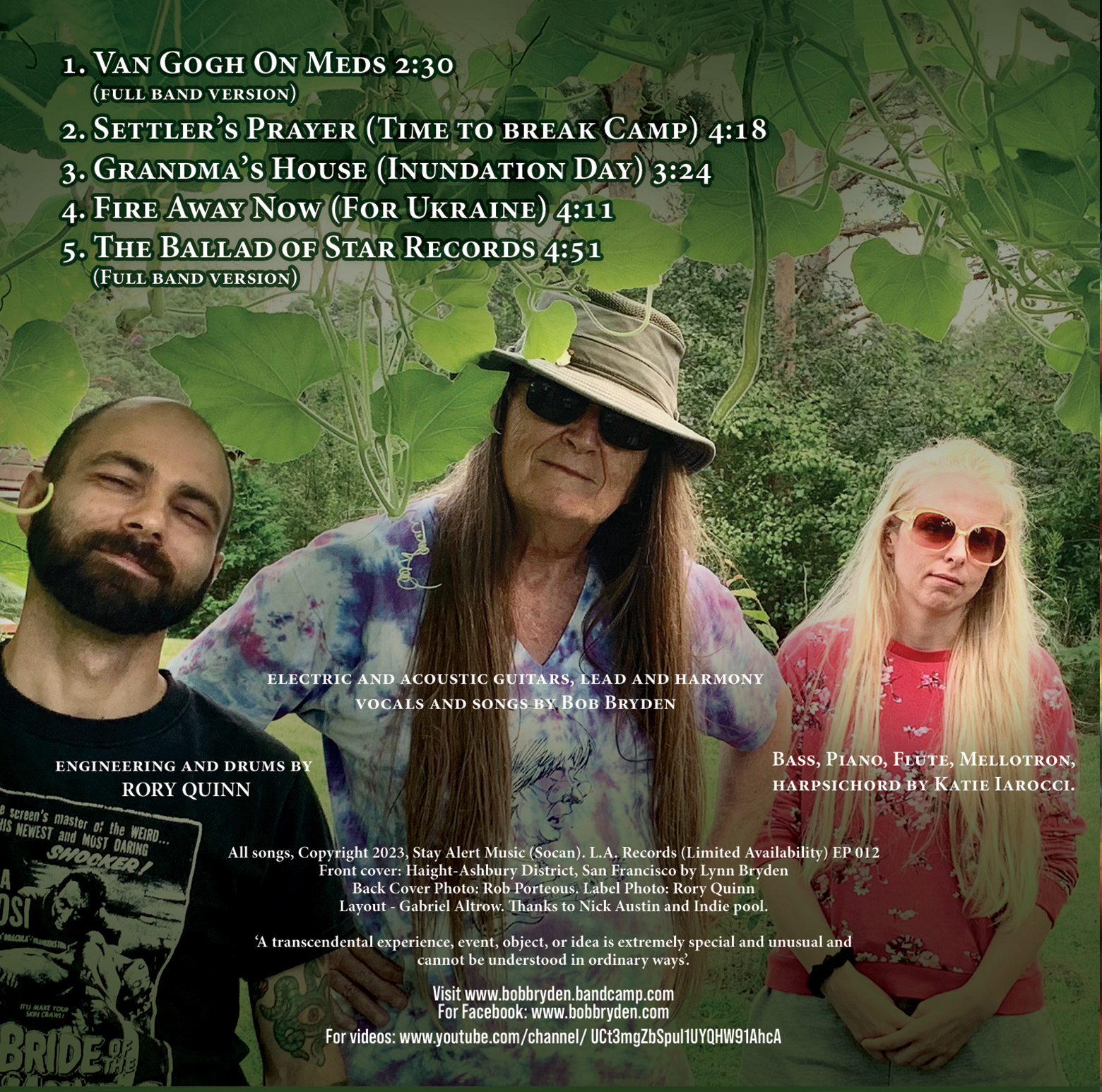 The 5 song EP was recorded between November 2022 and April 2023. Bob Bryden plays all the electric and acoustic guitars, and does all the vocals - lead and harmony. If features Long Day Journey (AKA Rory Quinn) on drums and Katie Iarocci on bass, piano, flute, mellotron and harpsichord. It contains two songs which are documentary in nature - 'Grandma's House (Inundation Day)' is Bob's recollection and indictment of the flooding of 11 villages (including Mille Roche were Bob's family had resided) in Ontario to expand the St. Lawrence Seaway in 1959. The second 'doc' is 'The Ballad of Star Records' which chronicles Bob's experiences as manager of one of the first punk rock/alternative records stores and labels. There is also a song dedicated to the freedom fighters of the Ukraine ('Fire Away Now'); a western ('Settler's Prayer - Time To Break Camp') and one just for fun, 'Van Gogh On Meds' (What would he have been like? Or more importantly, 'What would his art have been like?!'