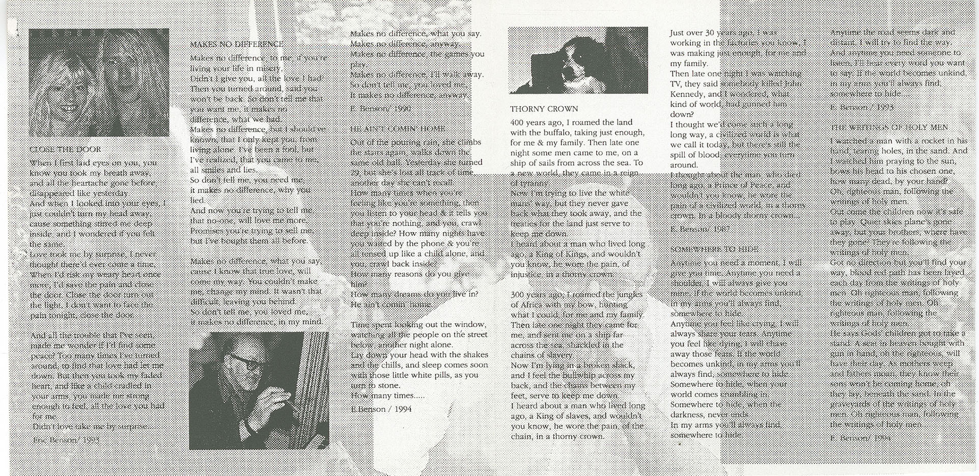 Shortly after its release in 1997, Eric Benson’s first CD “Close the Door”, gained accolades from veterans in the music world, and received airplay on FM, college radio and AM stations here in BC, and on budding internet radio stations and music sites worldwide. The “Door” is actually a window into the soul of this gifted artist. Eric is known for his ability to put pure emotions onto paper, and capture an audience within the songs striking melodies, and his soothing vocals. He has shared the stage with music icons Amanda Marshall, Ian Tyson, Juice Newton, Valdy, Queen of slide guitars Ellen McIllwain, and Roy Clark, to name a few.