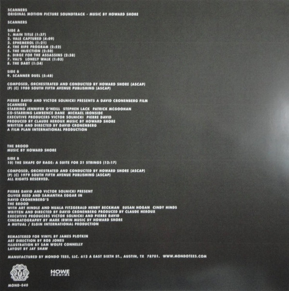 On January 13, 2015, in collaboration with Howe Records, Mondo released a special “two cover” LP for director David Cronenberg’s classic mind and body-bender films Scanners and The Brood with original scores composed by Academy Award-winner Howard Shore.