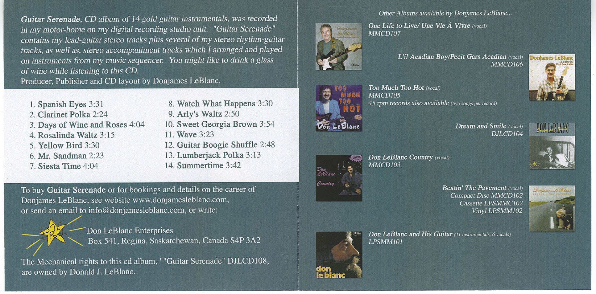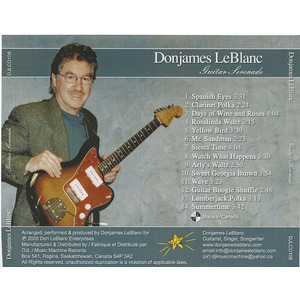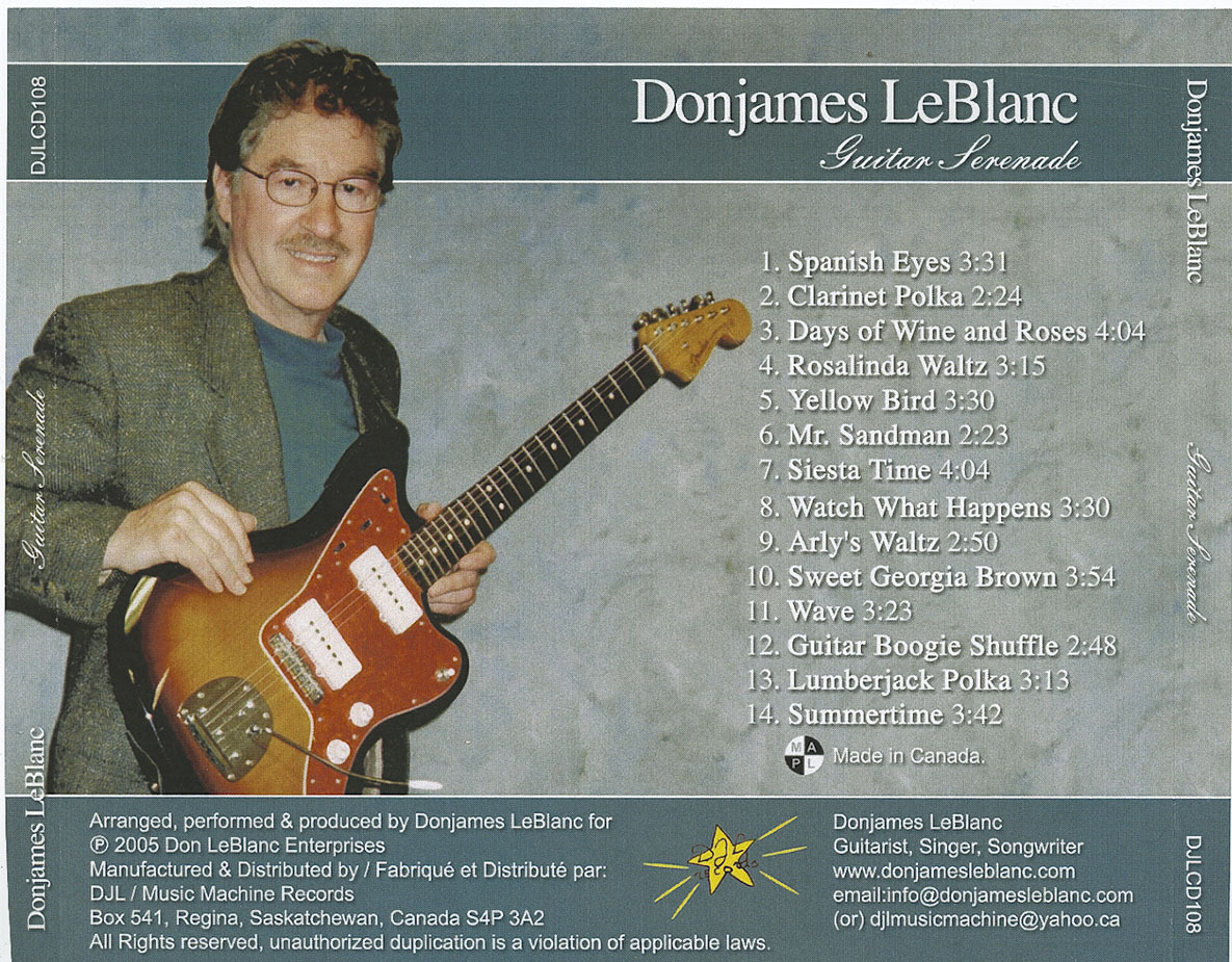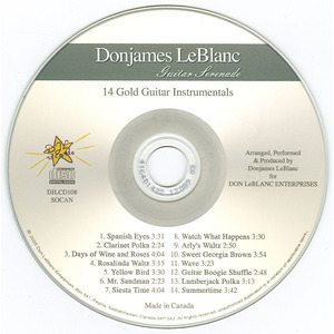 GUITAR SERENADE released May 2005 by Donjames LeBlanc is a Compact Disc Album of 14 GOLD ‘classic’ Guitar Instrumentals. It was recorded on location at Donjames’ DJL digital recording studio. “Guitar Serenade” contains several lead-guitar stereo tracks plus several stereo rhythm-guitar tracks by Donjames, as well as stereo accompaniment tracks arranged, produced and played on music-sequencer instruments. This is a very ‘clean’ relaxing Compact Disc! You might even want to dance!
