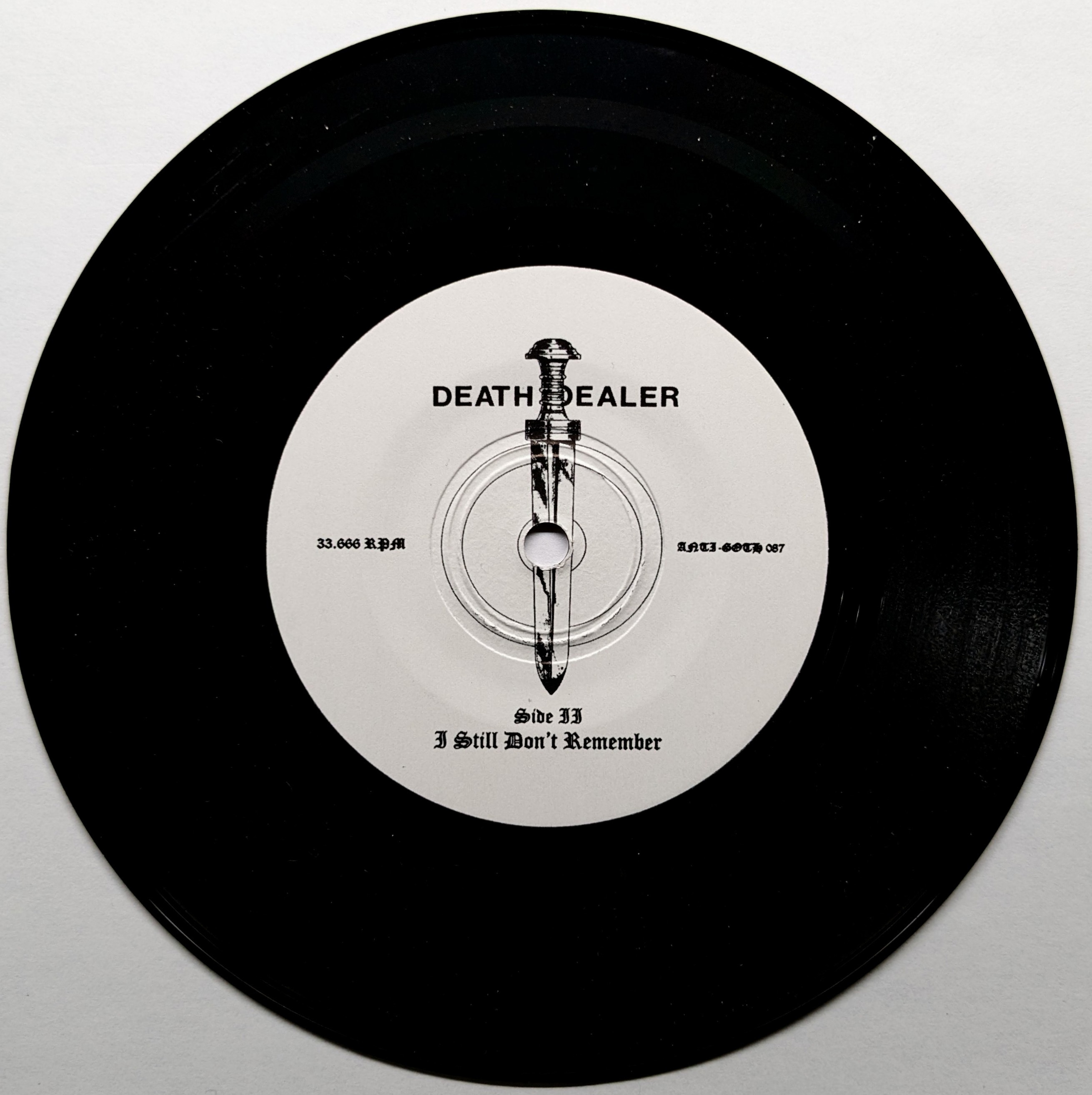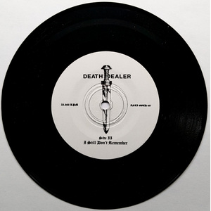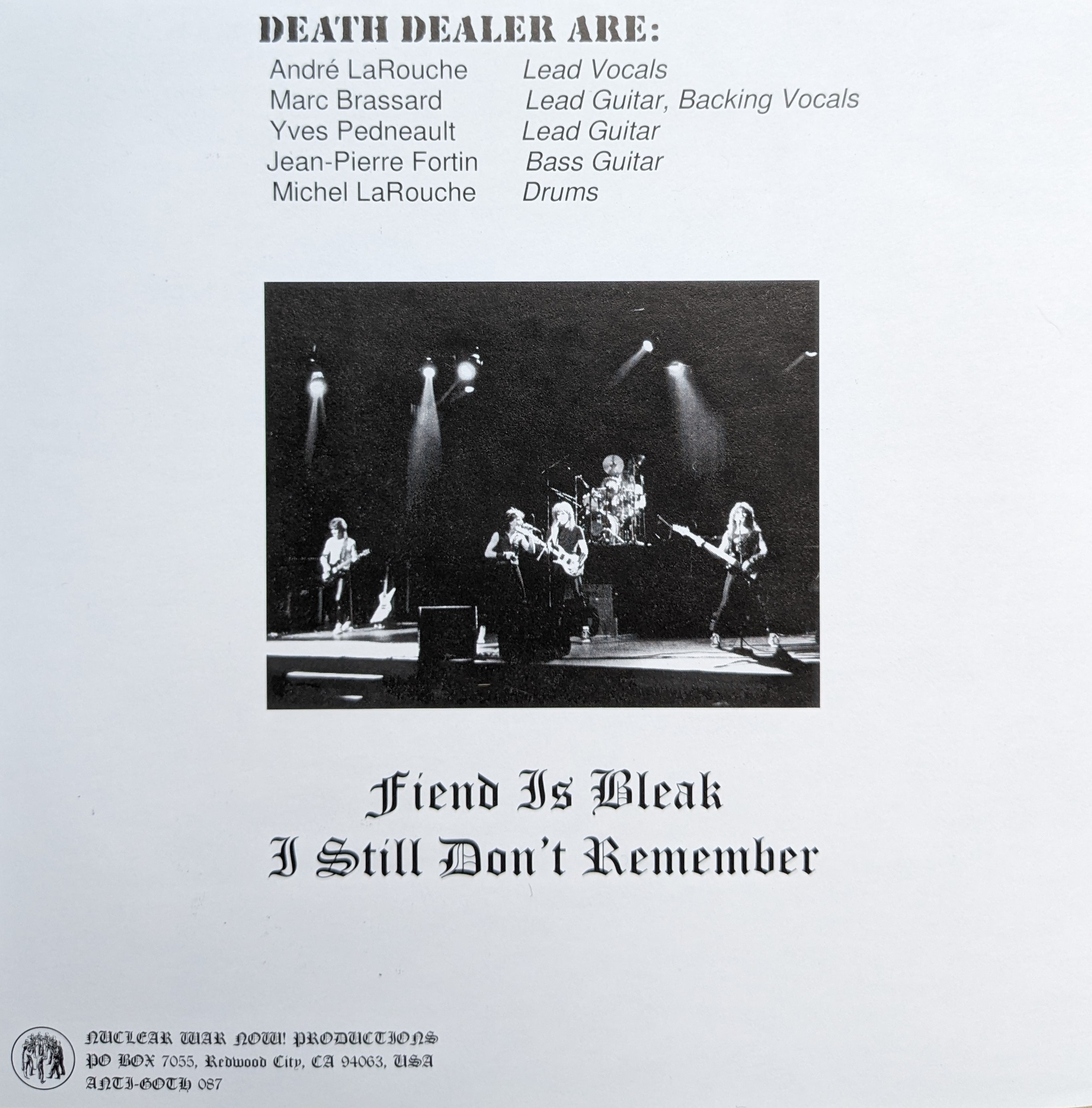 The ‘B’ side is the newcoming song ‘I still don’t remember’ composed in the late 1983 and that we presented for the first time in this tour. The text was at the final revision so an inversion of was we can say’ I don’t still’ instead of ‘I still don't 'occurs in this version played during the show. This song was taken from the last show of this tour in Roberval the January 08 at ‘La Turlute’. It was a fantastic song with its solo part ending by a pure Maiden combination of the two Guitars and remaining right after in the real Death Dealer style. A perfect mixture of old and new DD sound. Even for the first time playing, fans immediately adore this song. We played this song right after ‘Phantom of the opera’ from Maiden and it has been well received. I still don’t remember is the search for the remembering of the first years of my life. How to reconstruct the traces of this formatting memory in the brain. Should pieces of the past could be reanimated again! And after so many tries ‘I still don’t remember’…But only for the past of Death Dealer!!!