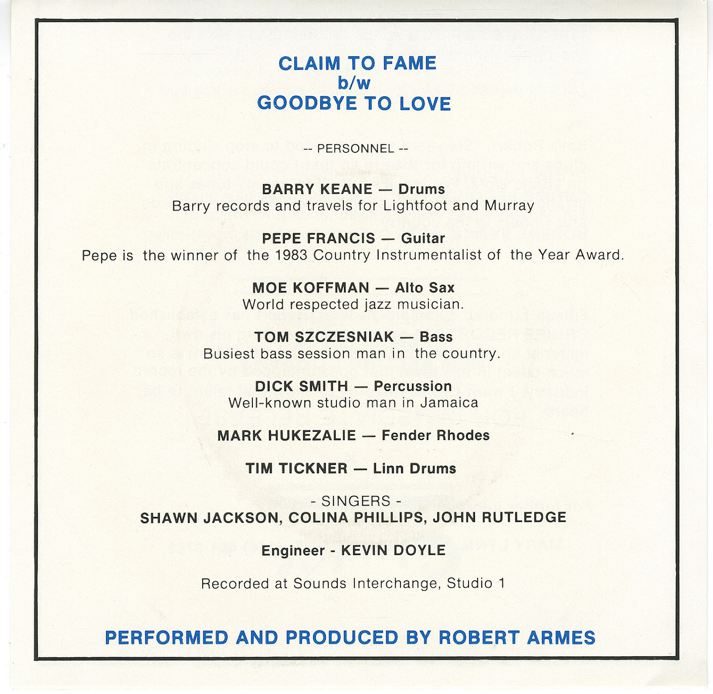 Armes, Robert - Claim to Fame b/w Goodbye to Love