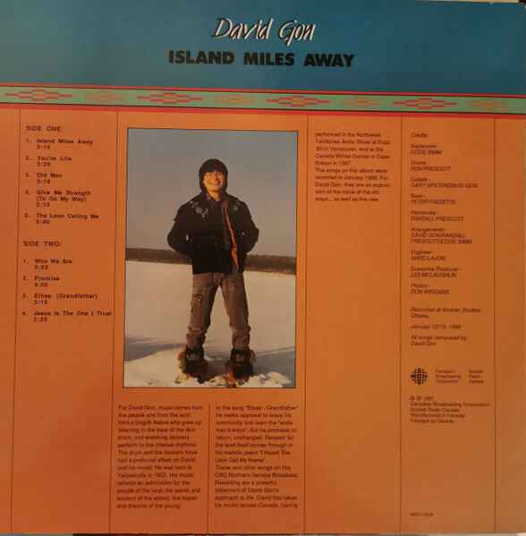 In the song "Ethsey (Grandfather)" he seeks approval to form his community and learn the "white man's ways". But he promises to return, unchanged. Respect for the land comes through in his melodic poem "The Loon Calling Me". These and other songs on this CBC Northern Service Broadcast Recording are a powerful statement of David Gon's approach to life. David has taken his music across Canada, having performed in the Northwest Territories Arctic Show at Expo '86 in Vancouver, and at the Canada Winter Games in Cape Breton in 1987.