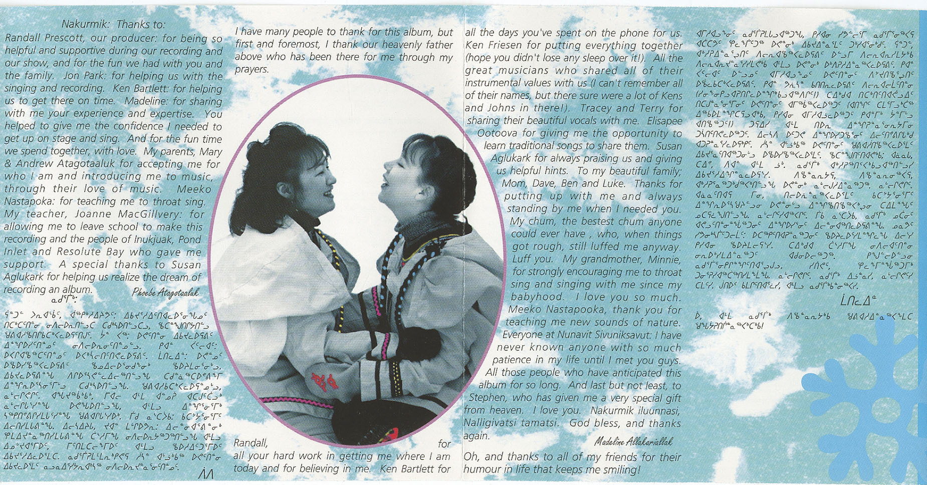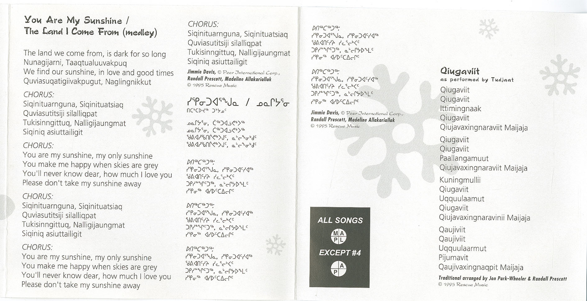 Another song on the CD Tudjaat released in 1995 is a medley of the familiar Southern song “You are my sunshine” and the new “The Land that I come from,” sung in both English and Inuktitut.