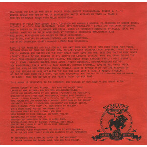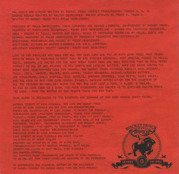 Very special thanks to Pelle, Eskil, Magnus, and Walter for the very great Pouch Cove and Umeå sessions that we will never forget, and to everyone who has helped us get this far: Michael & Jodi Stirling, the Pouch Cove sessions—good love, Yer Hearts, The Bucket Truck extended family: Mike Stewart, Mike Rowe, Jud Haynes, Walter, Sean Agnew, Tracey MacNamara, Michael Andrews, Mike Malek, all the friends of New York, Carlene Hill Family, massive appreciation for the making of this record to NewTel, Alcome who have lent a hand, a floor, a couch, or dollars. We love—from the bottom of our stupid black hearts, you have helped us to continue making music and for that, we thank you.