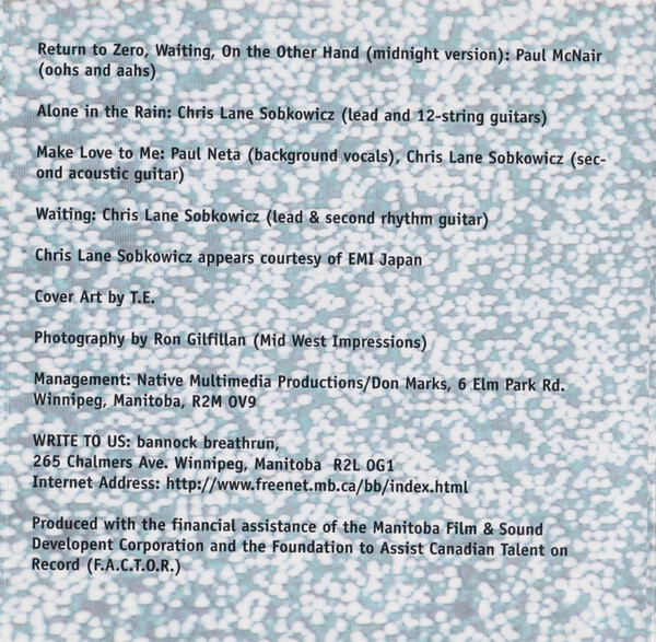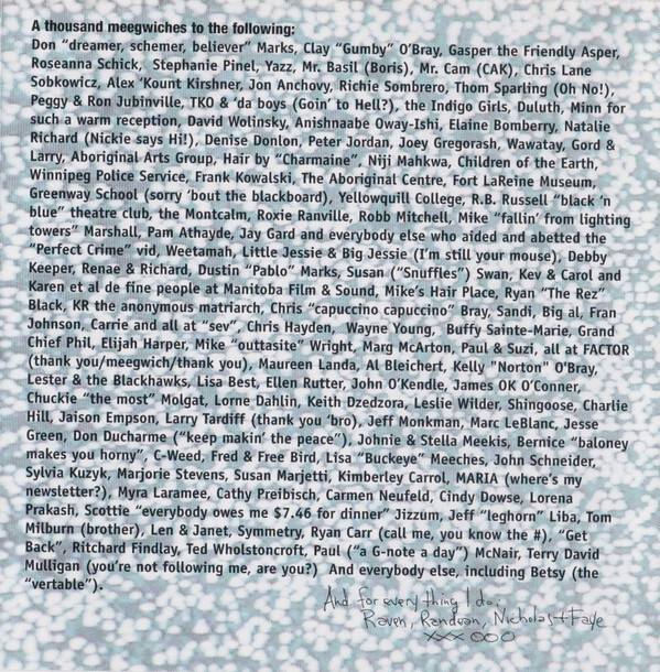 Don "dreamer, schemer, believer" Marks, Clay "Gumby" O'Bray, Gasper the Friendly Asper, Roseanna Schick, Stephanie Pinel, Yazz, Mr. Basil (Boris), Mr. Cam (CAK), Chris Lane Sobkowicz, Alex "Kount Kirshner," Jon Anchovy, Richie Sombrero, Thom Sparling (Oh No!), Peggy & Ron Jubinville, TKO & da boys (Goin' to Hell), the Indigo Girls, Duluth, Minn for such a warm reception, David Wolinsky, Anishinaabe Oway-Ishi, Elaine Bomberry, Natalie Richard (Nicole says Hi!), Denise Donlon, Peter Jordan, Joey Gregorash, Wawatay, Gord & Larry, Aboriginal Arts Group, Hair by "Charmaine", Niji Mahkwa, Children of the Earth, Winnipeg Police Service, Frank Kowalski, The Aboriginal Centre, Fort LaReine Museum, Greenway School (sorry 'bout the blackboard), Yellowquill College, R.B. Russell "black 'n blue" theatre club, the Montcalm, Roxie Ranville, Robb Mitchell, Mike "fallin' from lighting towers" Marshall, Pam Athayde, Jay Gard and everybody else who aided and abetted the "Perfect Crime": Reid, Weedatam, Little Jessie & Big Jessie (I'm still your mouse), Debby Keeper, Renee & Richard, Dustin "Pablo" Marks, Susan ("Snuffles") Swan, Kev & Carol and Karen et al the fine people at Manitoba Film & Sound, Mike's Hair Place, Ryan "The Raz" Black, KT the anonymous anti-matricarch, Chris "cappuccino capuccino" Bray, Sandi Big AJ, Fran Johnson, Carrie and all at "sev", Chris Hayden, Wayne Young, Buffy Sainte-Marie, Grand Chief Phil, Elijah Harper, Mike "outtasite" Wright, Marc McCarton, Paul & Suzi, all at FACTOR (thank you/meegwetch/thank you), Maureen Landa, Al Bleichert, Kelly "Norton" O'Bray, Lester & the Blackhawks, Lisa Best, Ellen Rutter, John O'Kendle, James OK O'Connor, Chuckie "the most" Molgat, Lorne Dahlin, Keith Dzedzora, Leslie Wider, Shingoose, Charlie Hill, Jason Empson, Larry Tardiff (thanks too), Jeff Morrison, Marc Leiberman, Basil Green, Don Ducharme ("keep makin' the peace"), Johnnie & Stella Meeks, Bernice "baloney flakes no turkey" C-Weed, Peggy & Leslie, Richard Mulligan, Kevin Schick, Sylvia Kuzyk, Marjorie Stevens, Susan Marjett, Kimberley Carrol, MARIA (where's my newsletter?), Myra Lazare, Cathy Preibisch, Carmen Neufeld, Jeff Didora, Anne-Marie Prakaski, Scottie "everybody owes me $7.66 for dinner" Jizzum, Jeff "leghorn" Liba, Tom Mulligan (you're not following me, are you?), and everybody else, including Betsy (the 'vertable').