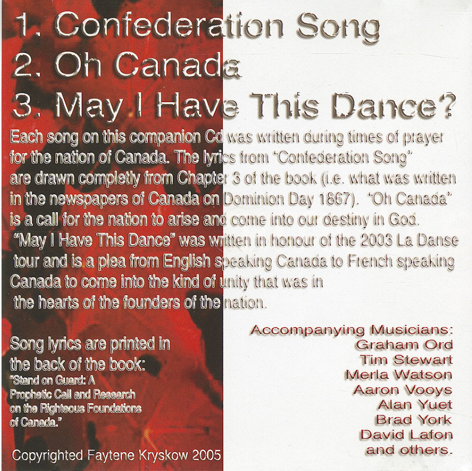 Each song on this companion CD was written during times of prayer for the nation of Canada. The lyrics from "Confederation Song" are drawn completely from Chapter 3 of the book (i.e. what was written in the newspapers of Canada on Dominion Day 1867). "Oh Canada" is a call for the nation to arise and come into our destiny in God.