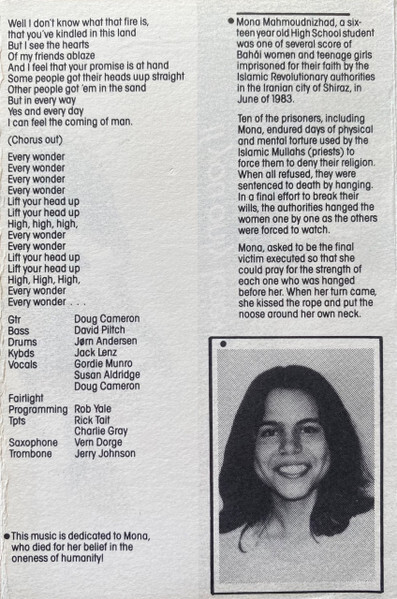 "This music is dedicated to Mona, who died for her belief in the oneness of humanity."
