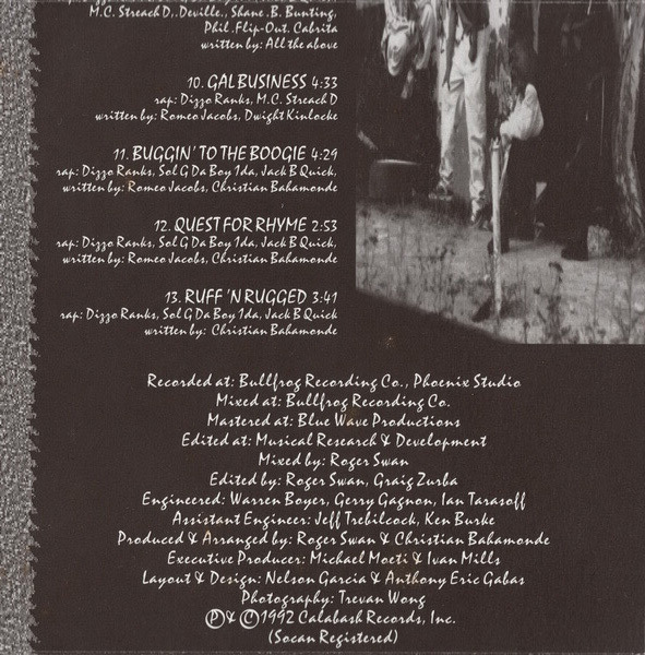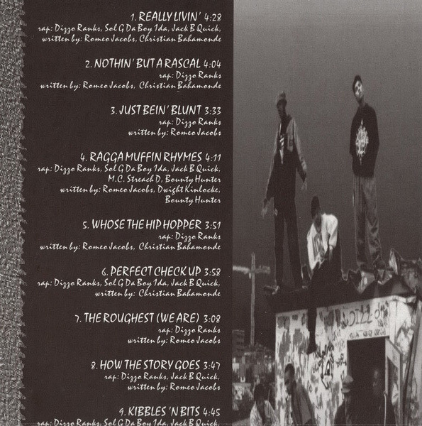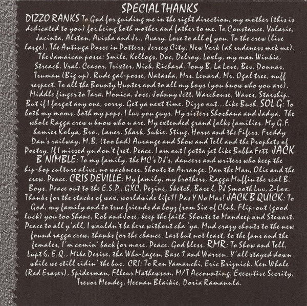 DIZZO RANKS: To God for guiding me in the right direction, my mother (this is dedicated to you) for being both mother and father to me. To Constance, Valarie, Jacinta, Alston, Avian, and Jr., Avary. Love to all of you. To the crew (Live Large), The Antigua Posse in Potters, Jersey City, New York (ak rudeness mek me). The Jamaican posse: Smile, Kellegs, Deo, Delroy, Lexly, my man Winkie, Streak, Vaal, Censor, Traiter, Nick, Richard, Tony B, La Love, Bev, Donna, Truman (Big up). Rude gal-posse, Natasha, Mrs. Leonard, Ma. Ogal tree, nuff respect. To all the Bounty Hunters and to all my boys (you know who you are). Middle finger to Tara, Monica, Jere, Johnny Jett, Warehouse, Waves, Starship. But if I forgot anyone, sorry. Get ya next time. Dizzo out... like Bush.