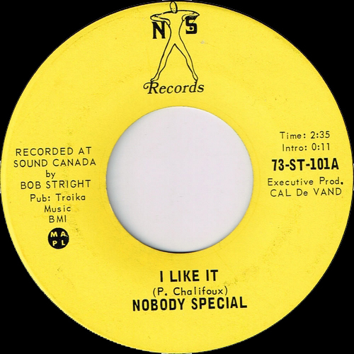 "The eight-piece group Nobody Special was formed in 1971 in Sudbury, Ontario. In 1973 the group entered a contest held by Sudbury-area radio station CHNO, and they won the title "Best Group in Northern Ontario." The prize included an all-expenses paid trip to a Toronto recording studio to record two of their songs for release on CHNO’s record label “NO Records” (“Northern Ontario Records”). The 45rpm record had “I Like It” on Side A and “Sha-La-La” on Side B. The group subsequently created their own record label “NS Records” (“Nobody Special Records”) to press more copies and continue promoting their music. After spending the next couple of years touring Ontario, Canada’s Maritime Provinces and some northern states of the USA, Nobody Special reformed as Spectacle."