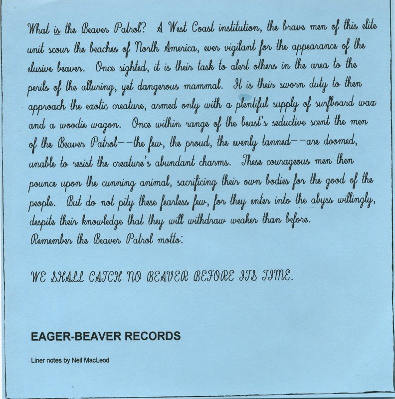 What is the Beaver Patrol? A West Coast institution, the brave men of this elite unit scour the beaches of North America, ever vigilant for the appearance of the elusive beaver. Once sighted, it is their task to alert others in the area to the perils of the alluring, yet dangerous mammal. It is their sworn duty to then approach the exotic creature, armed only with a plentiful supply of surfboard wax and a woodie wagon. Once within range of the beast’s seductive scent the men of the Beaver Patrol—the few, the proud, the evenly tanned—are doomed, unable to resist the creature’s abundant charms. These courageous men then pounce upon the cunning animal, sacrificing their own bodies for the good of the people. But do not pity these fearless few, for they enter into the abyss willingly, despite their knowledge that they will withdraw weaker than before.