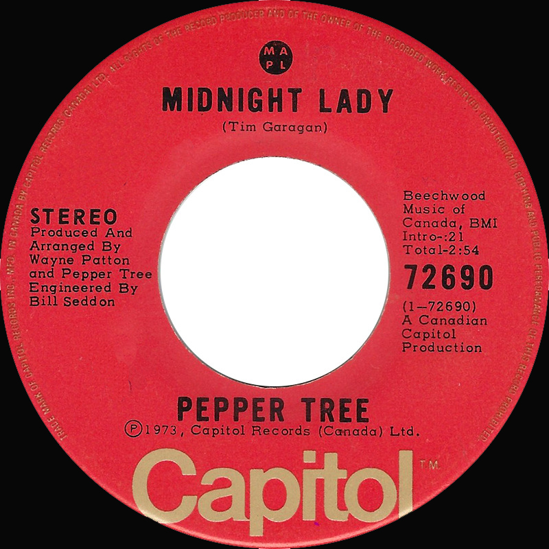Released in February 1973, this was Pepper Tree’s sixth single, and the first to be fully credited as produced and arranged by the band themselves in collaboration with Wayne Patton. Both tracks are non-album recordings: “Midnight Lady” was composed by Tim Garagan, and “Teach Me How To Fly” by Bob Quinn, reflecting the band's continued creative output during their final phase under Capitol.