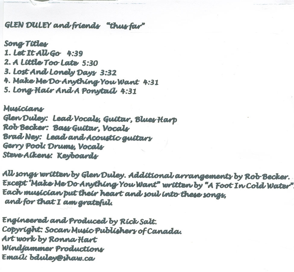 Glen Duley: lead vocals, guitar, blues harp