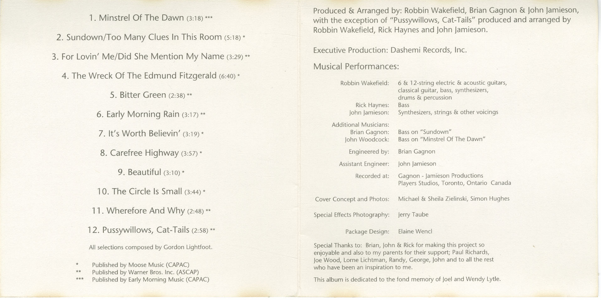 This album is dedicated to the fond memory of Joel and Wendy Lytle.