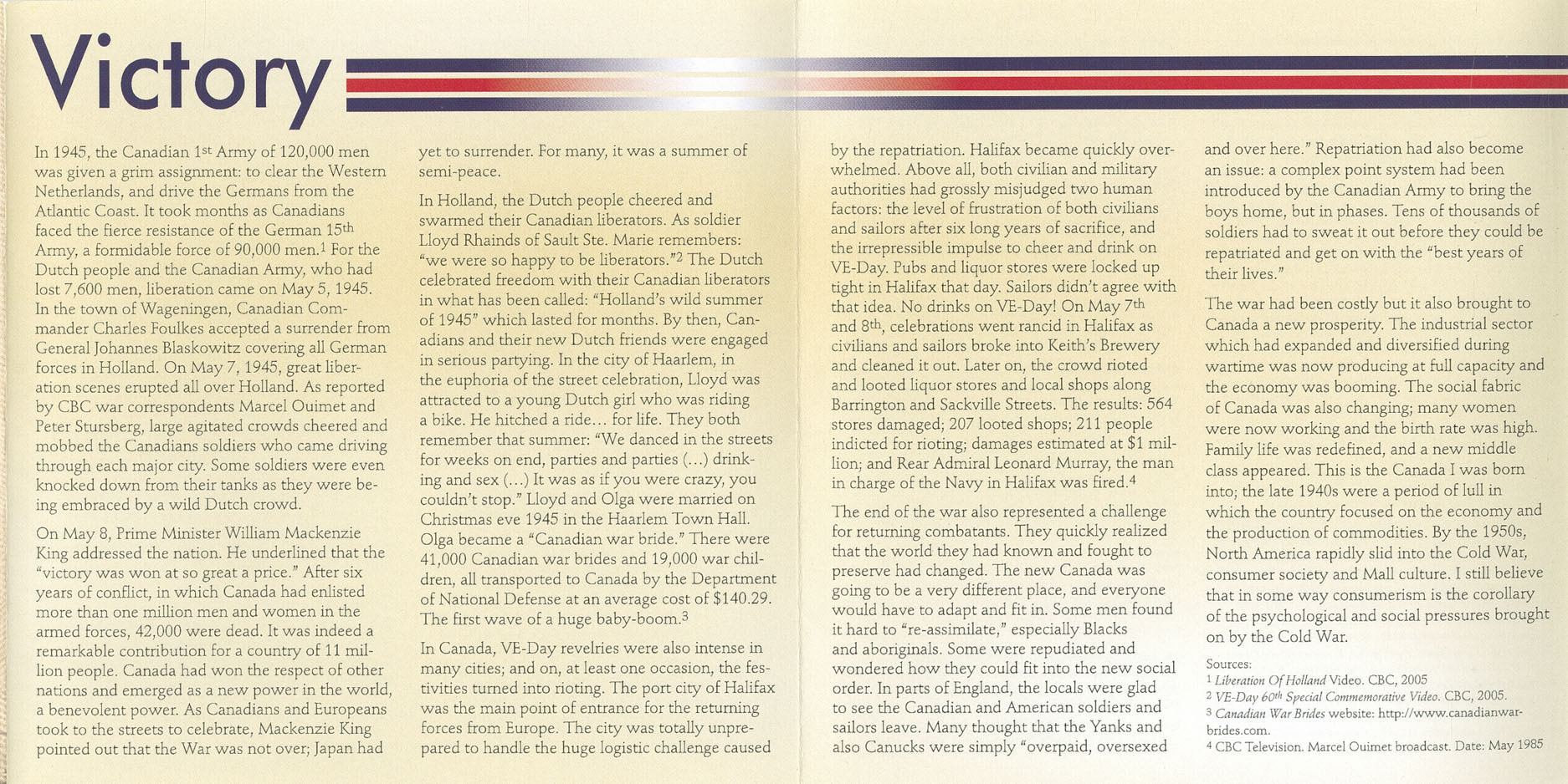 The end of the war also presented a challenge for returning combatants. They quickly realized that the world they had known and fought to preserve had changed. The new Canada was going to be a very different place and everyone would have to adapt and fit in. Some men found it hard to “re-assimilate,” especially Blacks and aboriginals. Some were repudiated and wondered how they could fit into the new social order. In parts of England, people were glad to see the Canadian and American soldiers and sailors leave. Many thought the Yanks and also Canucks were simply “overpaid, oversexed and over here.” Repatriation had also become an issue: a complex point system had been introduced by the Canadian Army to bring the boys home, but in phases. Tens of thousands of soldiers had to sweat it out before they could be repatriated and get on with the “best years of their lives.”