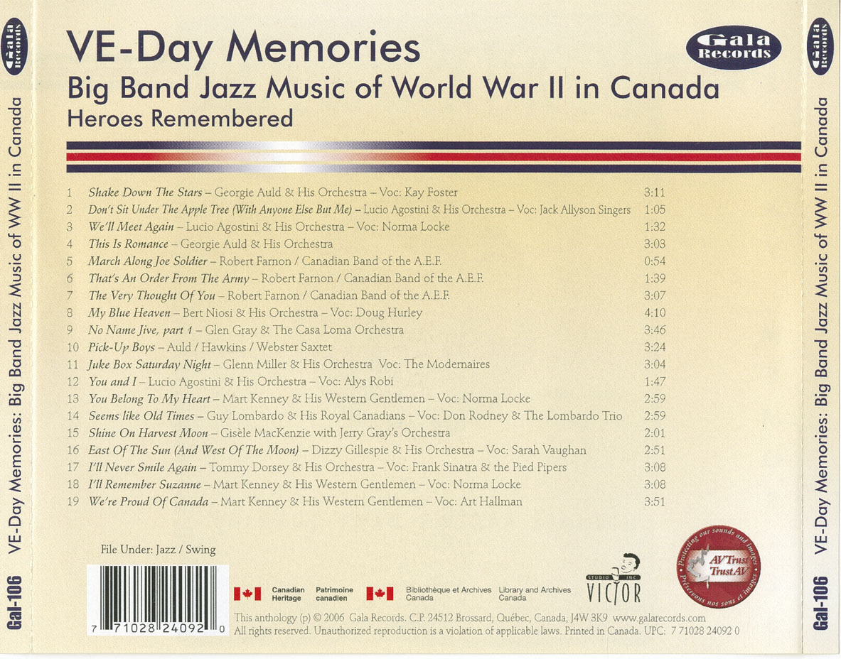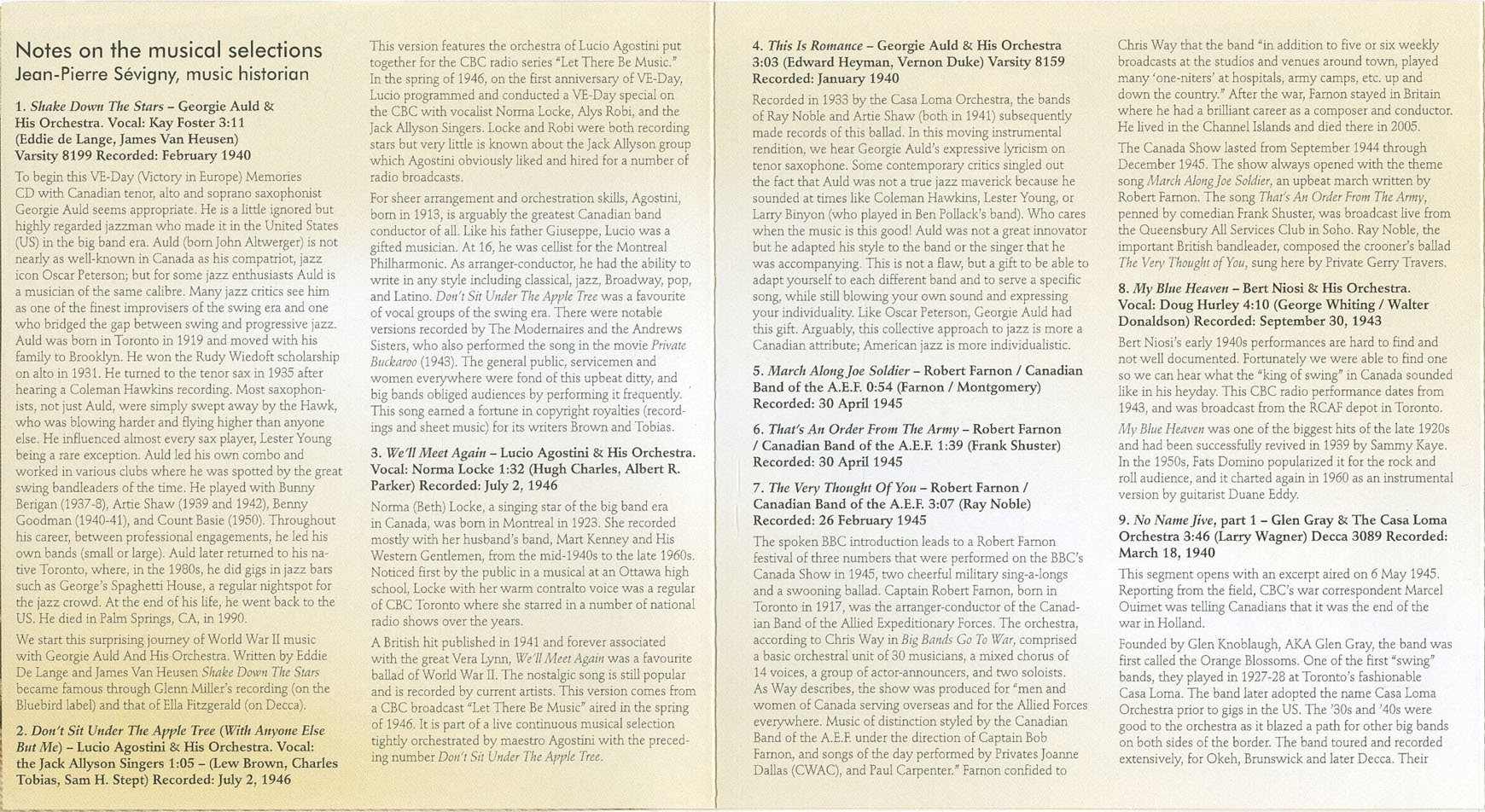 Finally, we have a patriotic march to close out this nostalgic pilgrimage to places and sounds of World War II. This is a Mart Kenney composition recorded in 1943 (Bluebird), an homage to his beloved Canada which was contributing all its resources to the war effort. A segment of Prime Minister William MacKenzie King’s address to the nation on May 8th 1945 is inserted between the instrumental overture and the vocal choruses of the song. Providing a fitting end to the recording, this song expresses the views of Canadians who felt proud and united as never before at the end of the war.