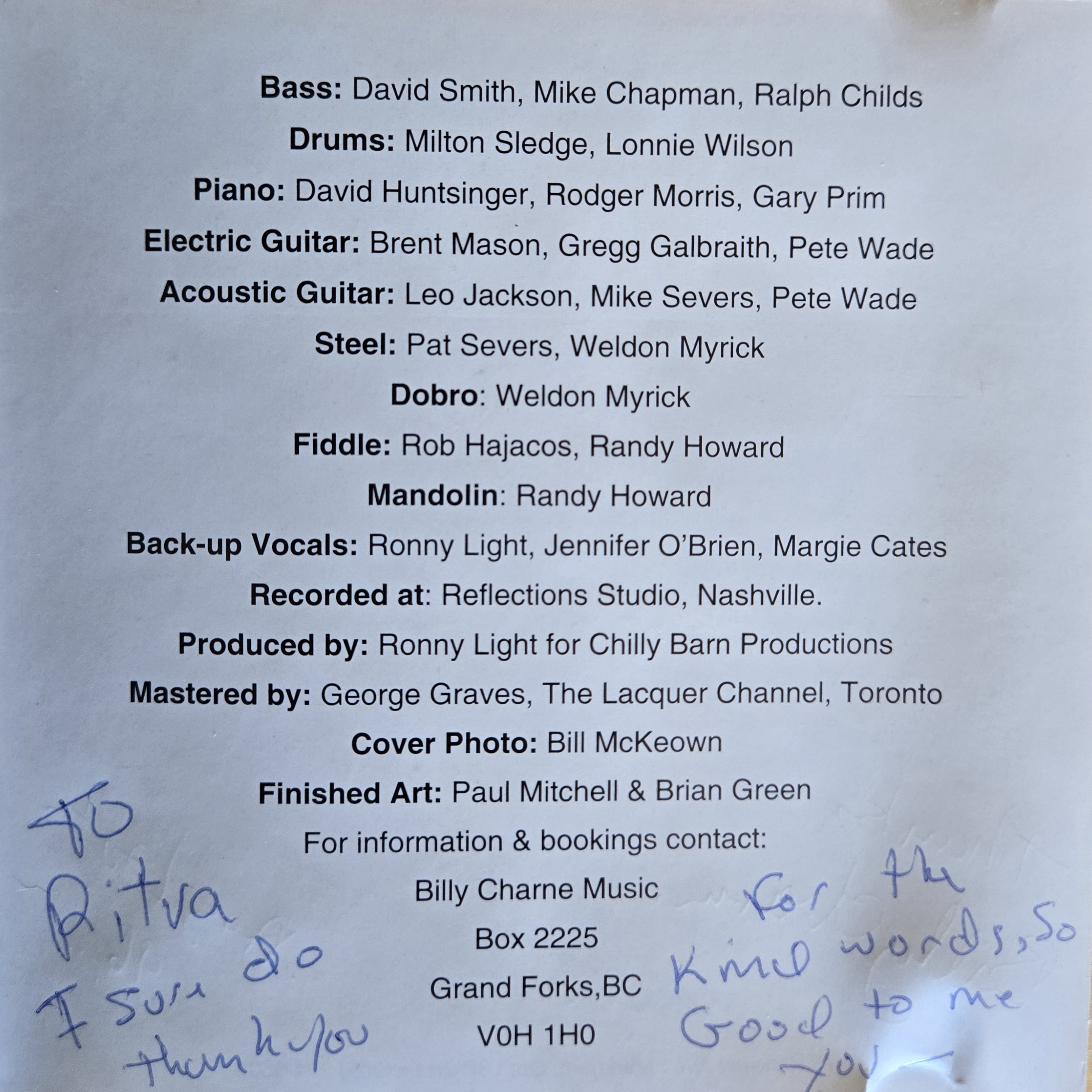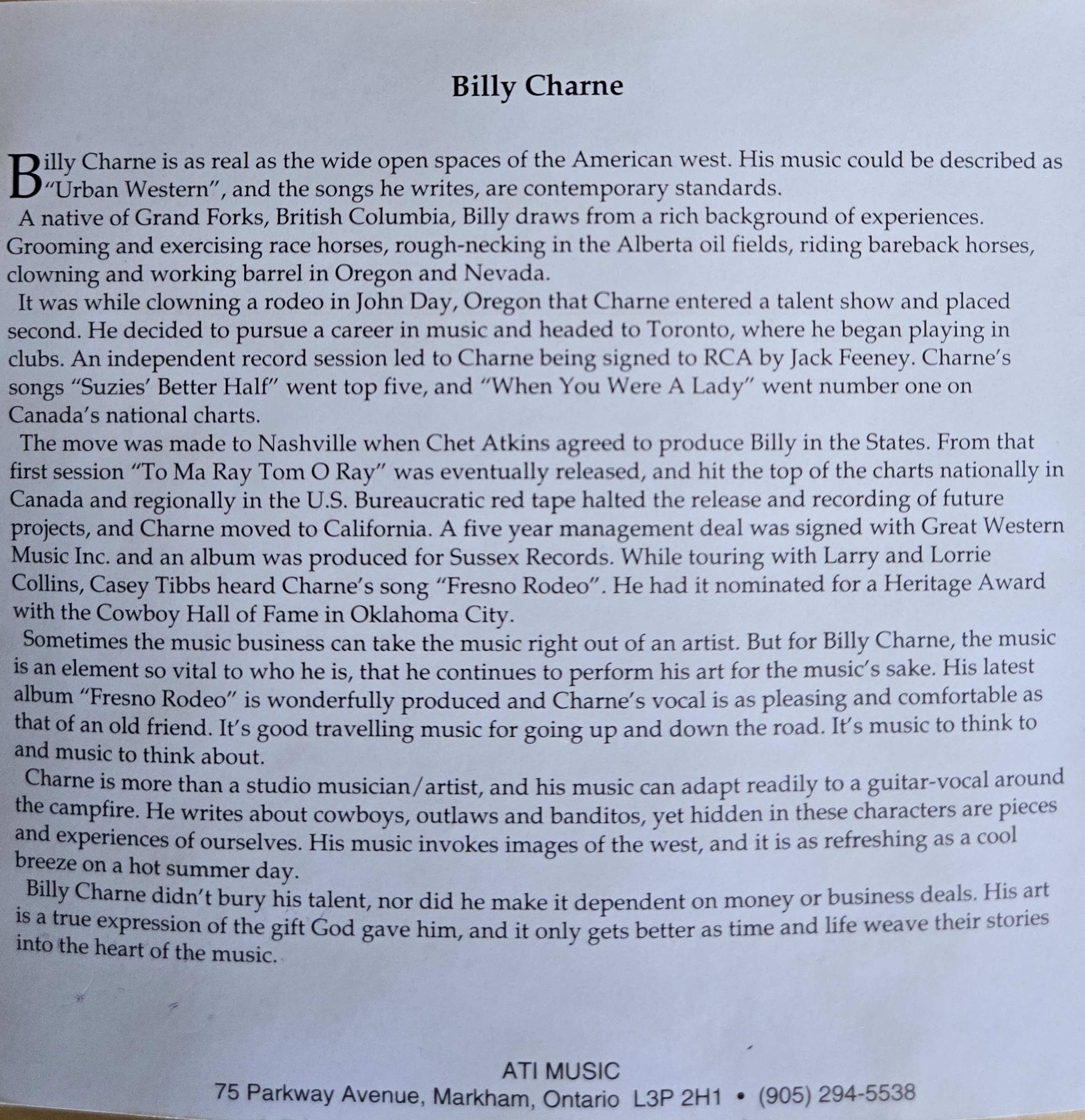 The move was made to Nashville when Chet Atkins agreed to produce Billy in the States. From that first session “To Ma Ray Tom O Ray” was eventually released, and hit the top of the charts nationally in Canada and regionally in the U.S. Bureaucratic red tape halted the release and recording of future projects, and Charne moved to California. A five year management deal was signed with Great Western Music Inc. and an album was produced for Sussex Records. While touring with Larry and Lorrie Collins, Casey Tibbs heard Charne’s song “Fresno Rodeo”. He had it nominated for a Heritage Award with the Cowboy Hall of Fame in Oklahoma City.