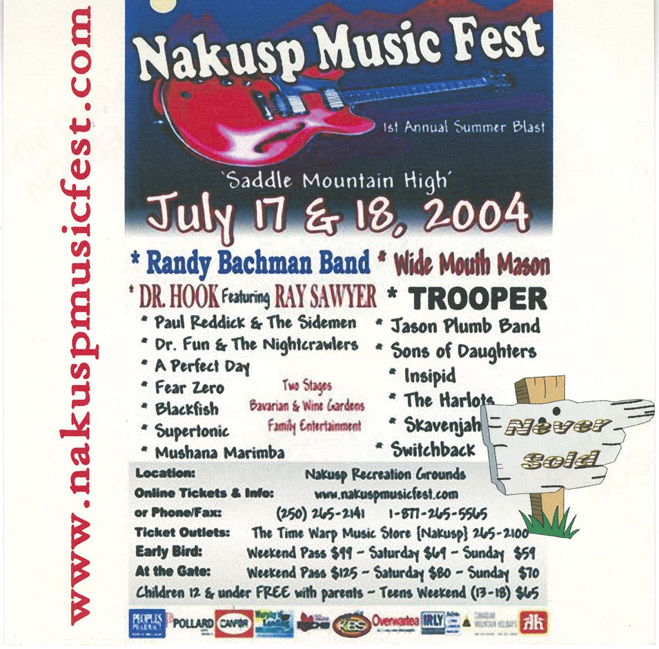 This two-disc set captures the inaugural 2004 Nakusp Music Fest lineup — a mix of Canadian indie acts, rock icons, and regional talent. The volunteer-run festival was held in Nakusp, British Columbia, from 2004 to 2011, set against a striking mountain-and-lake backdrop.