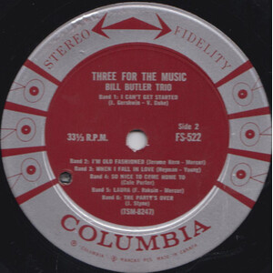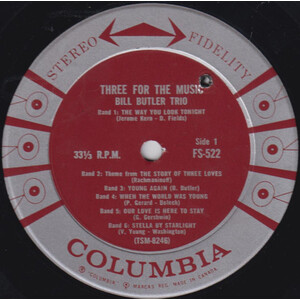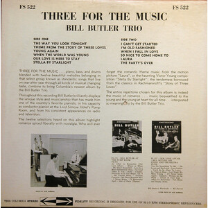 THREE FOR THE MUSIC … piano, bass, and drums blended with twelve beautiful melodies, belonging in that select group known as standards; songs that live on year after year through all kinds of musical changing taste, combine to bring Columbia’s newest album by the Bill Butler Trio.