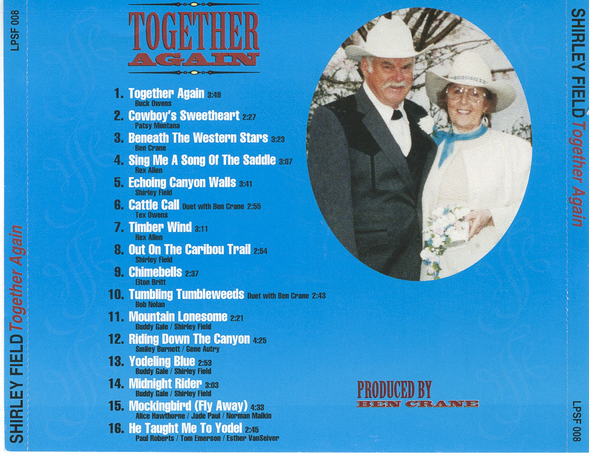 By the late 1970s and 1980s, Shirley returned to solo performance, with her focus increasingly on cowboy and gospel music. She recorded prolifically on cassette and CD, issuing albums such as Just A Yodel For Me, Seasons of Our Lives (1993), Yodeling Memories, The Country Side of Shirley Field, He Taught Me to Yodel, The Spirit of the Cowboy, Let the Wild Horse Run, and Together Again (1999). The latter was a deeply personal project, dedicated to her teenage sweetheart and eventual husband Fred Frederickson, with whom she reunited after decades apart.