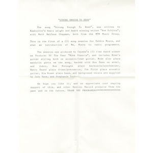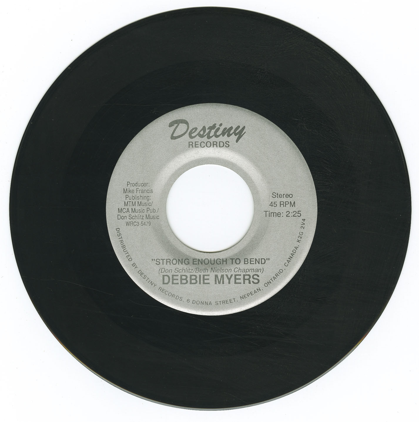 Her breakthrough came in 1989 with the Destiny Records single “Strong Enough to Bend.” Written by Nashville hitmakers Don Schlitz (“The Gambler”) and Beth Nielsen Chapman, the track was produced by three-time Canadian Producer of the Year Mike Francis, who also played guitar and mandolin. The studio lineup was exceptional: Barry Keane (longtime Gordon Lightfoot drummer), Ron Dann (steel/dobro), Ron Boroughs (keyboards), Kim Brant (bass), Jim Pirie (acoustic guitar), and backing vocals by celebrated Canadian singers Judy Tate (mother of Emilie-Claire Barlow, member of the Laurie Bower Singers) and Stephanie Taylor (of The Willows, and the cult solo album I Don’t Know Where I Stand). The single became a Top 10 Canadian country hit, staying on the charts for over 16 weeks. Shortly afterward, the song was picked up by Tanya Tucker, who turned it into an international No. 1, underscoring Myers’ role in helping launch a country standard.