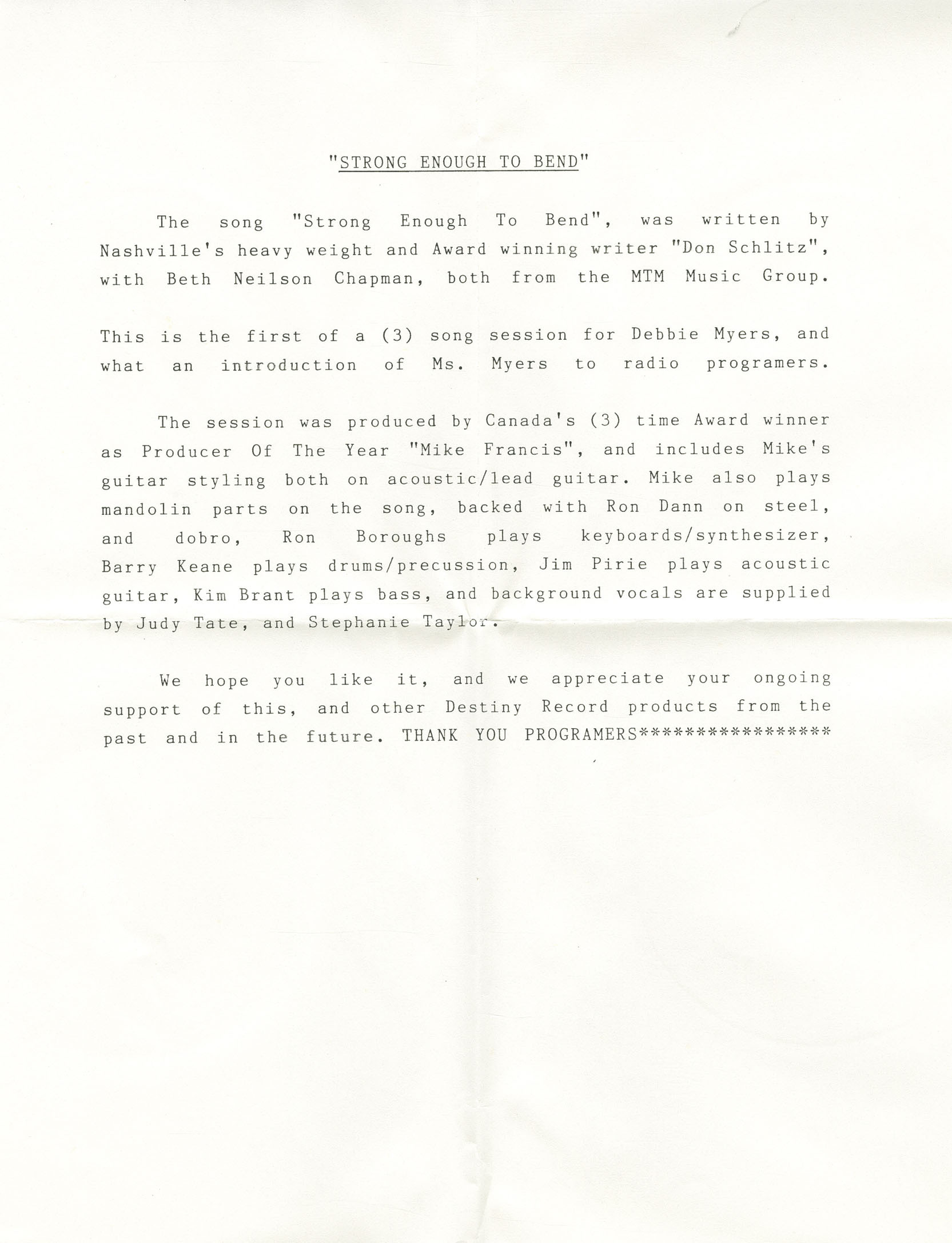 The song "Strong Enough To Bend", was written by Nashville’s heavy weight and Award winning writer Don Schlitz, with Beth Neilson Chapman, both from the MTM Music Group.